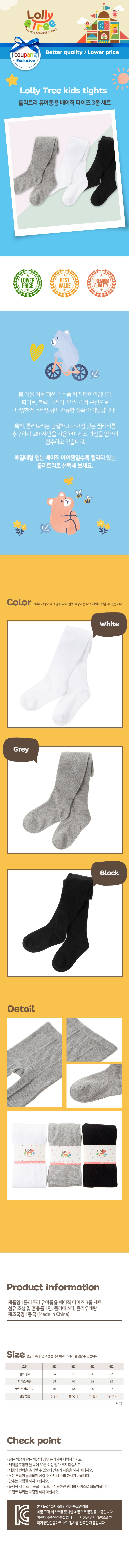 | 품명 및 모델명 | 롤리트리 유아동용 베이직 타이즈 3종 세트 (화이트, 그레이, 블랙), 3호 | KC 인증정보 | 유/KC마크 |
