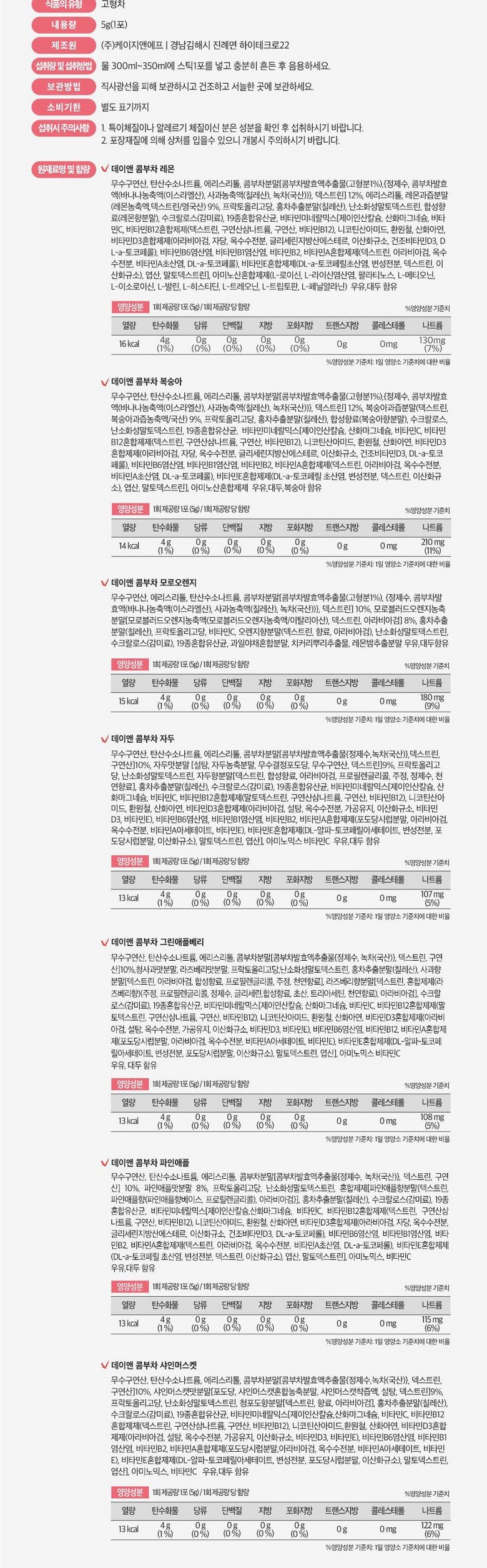 | 제품명 | 데이앤 콤부차 7종 세트 | 식품의 유형 | 고형차 |