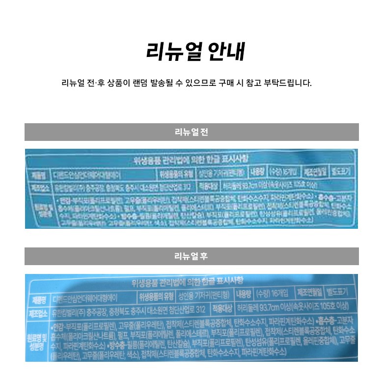 | 품명 및 모델명 | 디펜드 안심 언더웨어 대형 에이 | 인증/허가 사항 | 위생용품 |