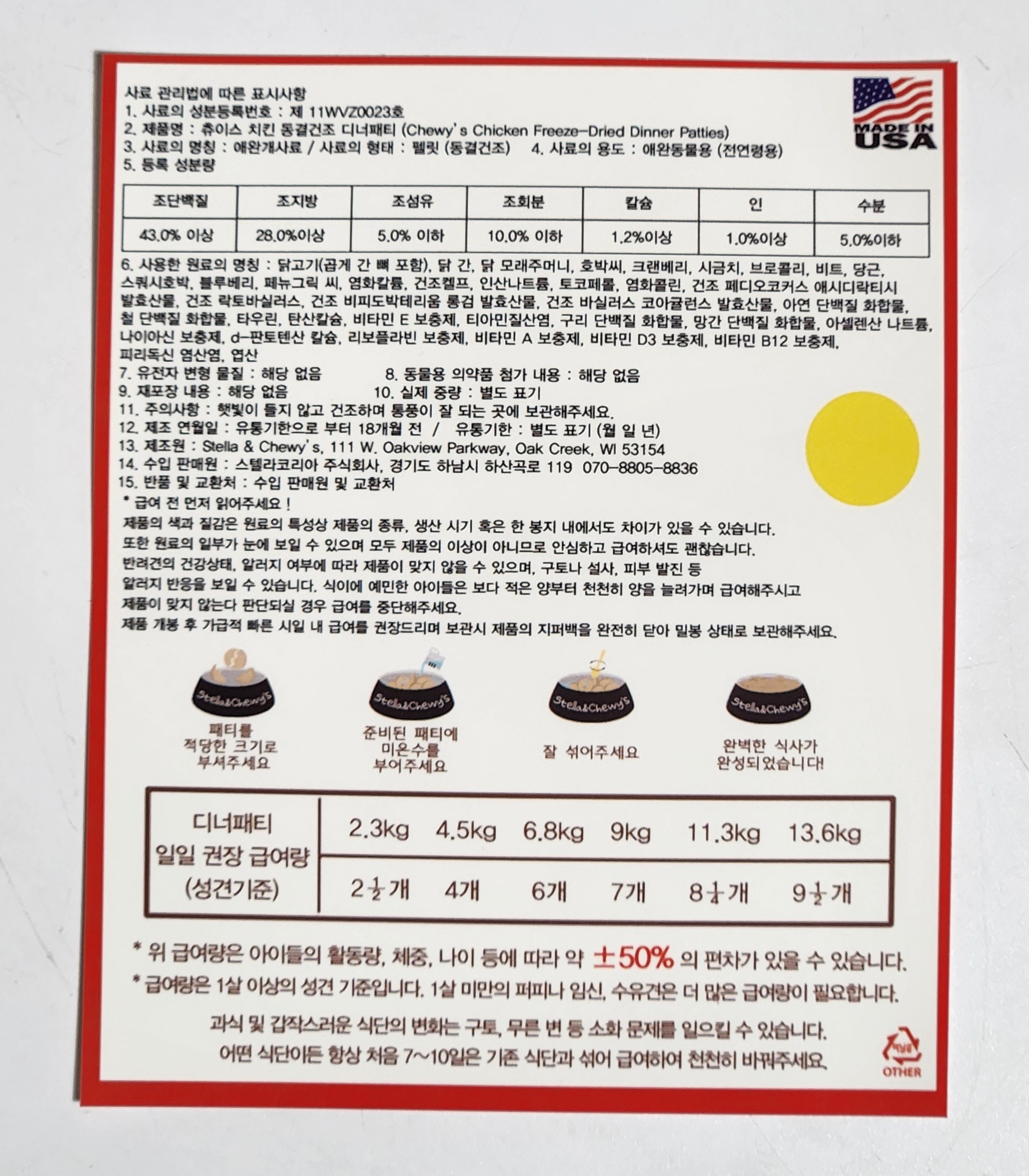 | 제조국(원산지) | 미국 | 제조자(수입자) | Stella & Chewy's / 스텔라코리아 |
