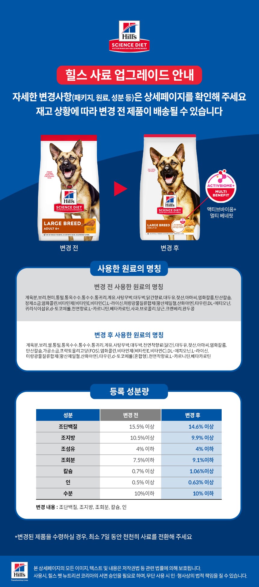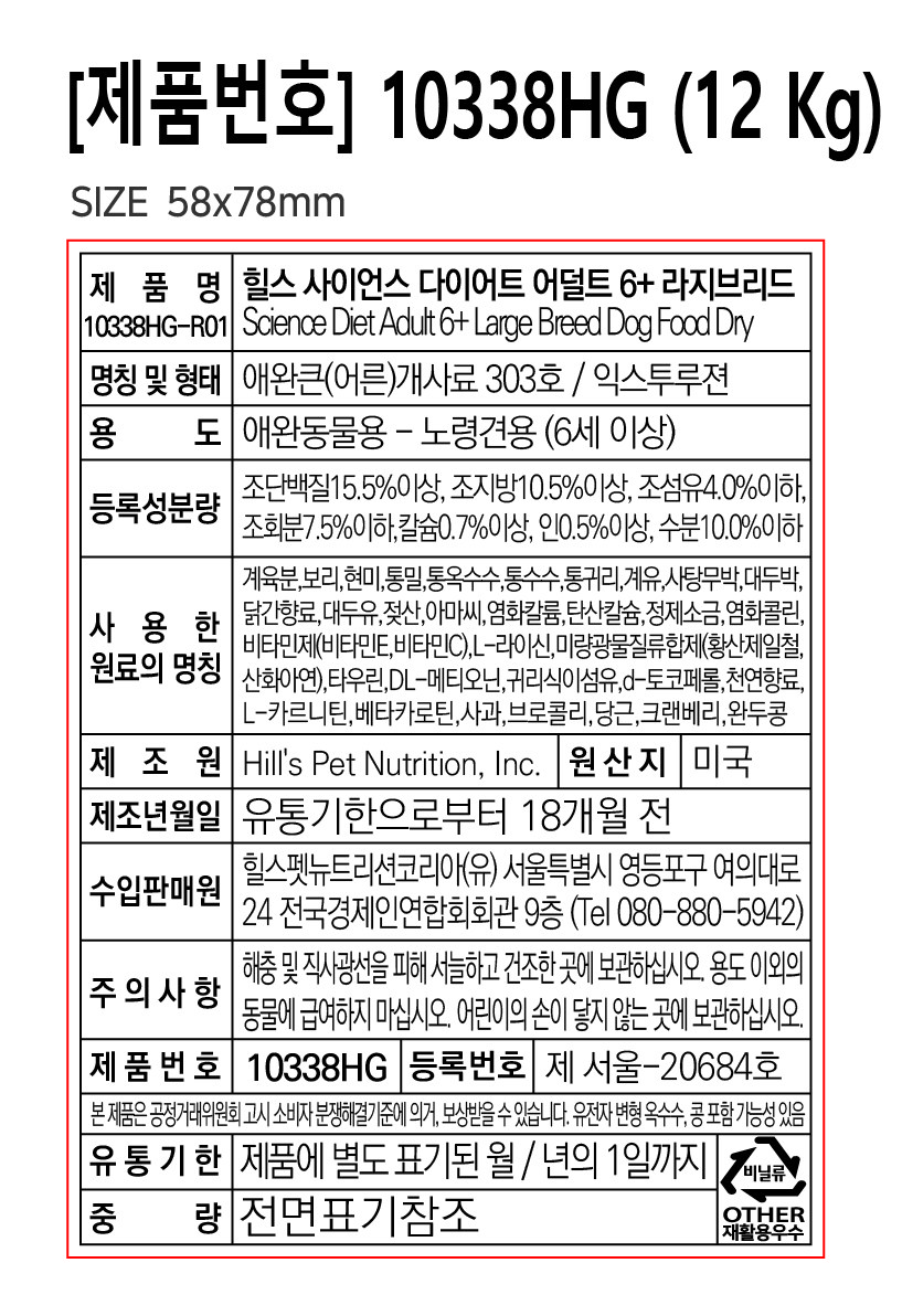 | 품명 및 모델명 | 힐스 사이언스 다이어트 어덜트 6+ 라지브리드 | 인증/허가 사항 | 사료관리법에 따른 성분등록번호 : 컨텐츠 참조 |