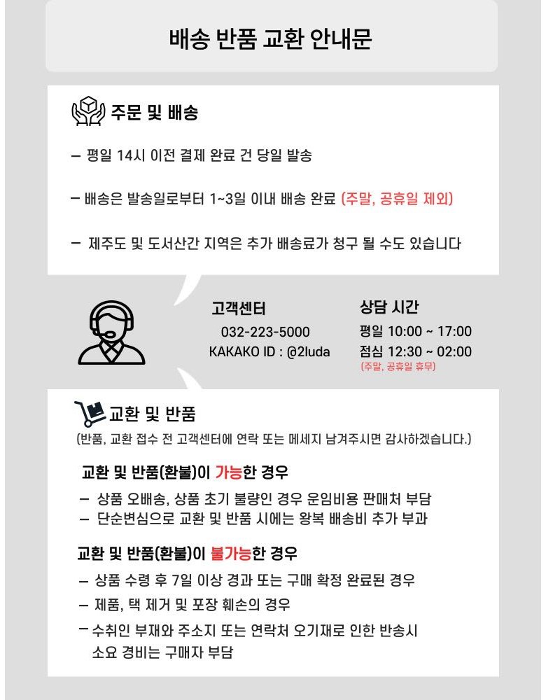 - ㆍ교환/반품에 관한 일반적인 사항은 판매자가 제시사항보다 관계법령이 우선합니다.
