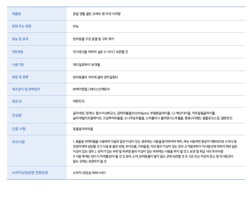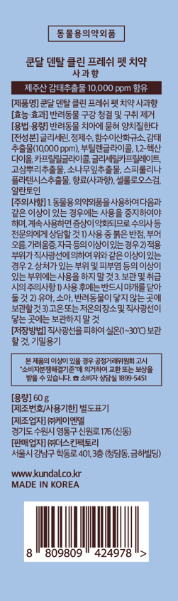 | 품명 및 모델명 | 쿤달 덴탈 클린 프레쉬 펫 치약 사과향 | 인증/허가 사항 | 동물용의약외품 |