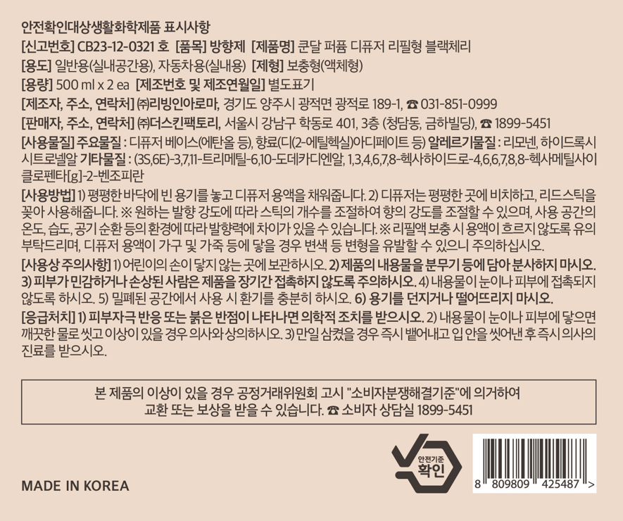 | 품목 및 제품명 | 방향제 / 쿤달 퍼퓸 디퓨저 리필형 블랙체리 | 용도(표백제의 경우 계열을 함께표시) 및 제형 | 자동차용(실내용),일반용(실내공간용) / 보충형(액체형) |
