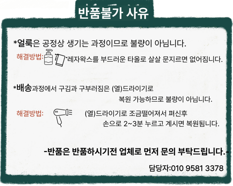 - ㆍ모니터 해상도의 차이로 인해 색상이나 이미지가 실제와 달라, 고객이 단순 변심으로 교환/반품을 무료로 요청하는 경우