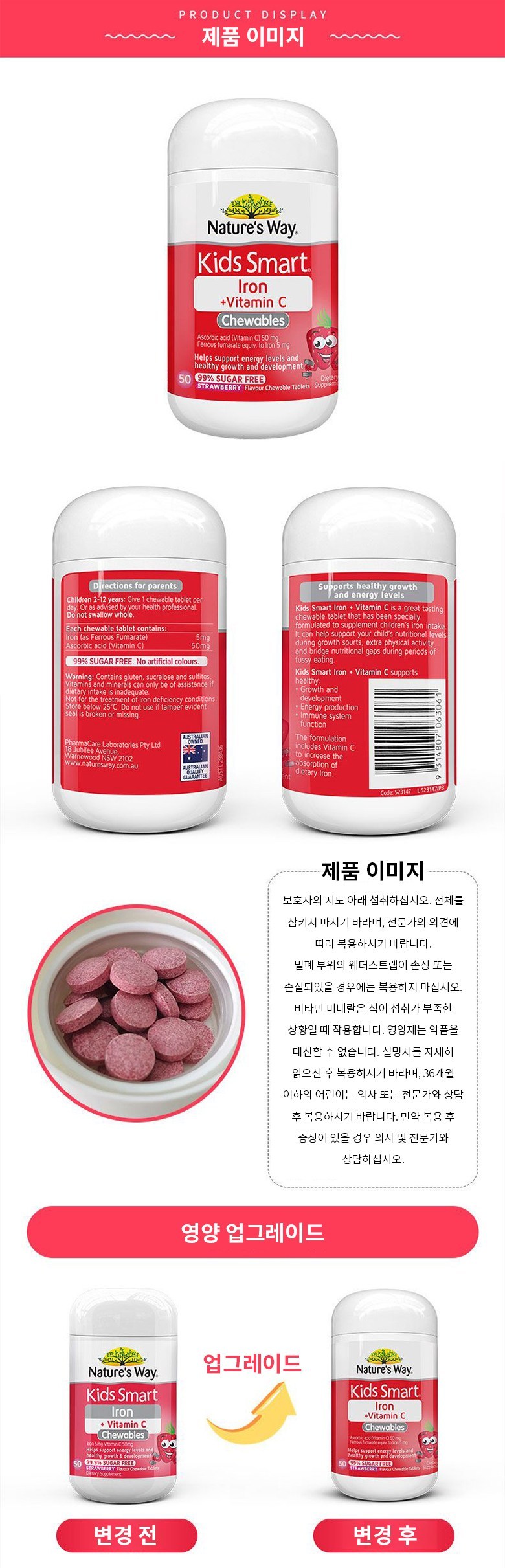 | 제품명 | 키즈 스마트 철분 + 비타민 C 츄어블 딸기맛 타블렛 | 식품의 유형 | 기타가공식품 |
