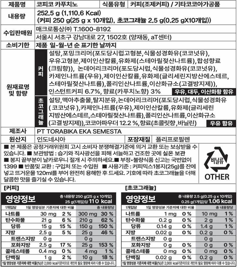 | 포장단위별 내용물의 용량(중량), 수량 | 25g x 10개입 x 4개 | 원재료명 및 함량 | 컨텐츠 참조 |