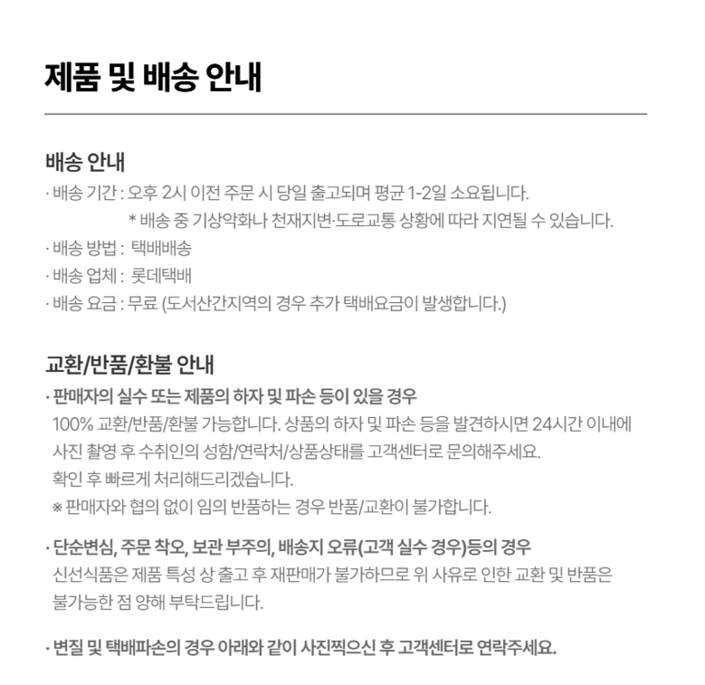 | 배송방법 | 순차배송 | 배송비 | 무료배송 - 도서산간 지역 배송불가 |