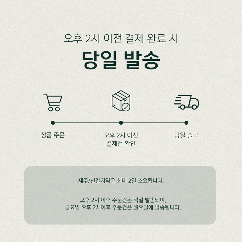 | 배송기간 | ㆍ도서산간 지역 등은 배송에 3-5일이 더 소요될 수 있습니다. - 천재지변, 물량 수급 변동 등 예외적인 사유 발생 시, 다소 지연될 수 있는 점 양해 부탁드립니다. | ||