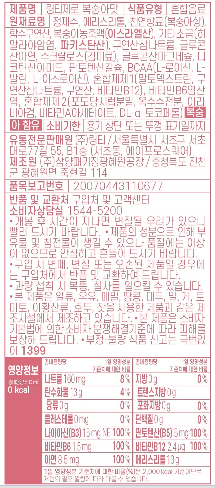 | 포장단위별 내용물의 용량(중량), 수량 | 500ml x 12개 | 원재료명 및 함량 | 컨텐츠 참조 |