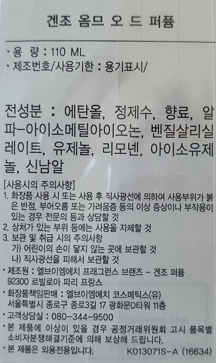 | 화장품제조업자, 화장품책임판매업자 및 맞춤형화장품판매업자 | 엘브이엠에치프래그런스 브랜즈 / 엘브이엠에치 코스메틱스(유) | 제조국 | 프랑스 |