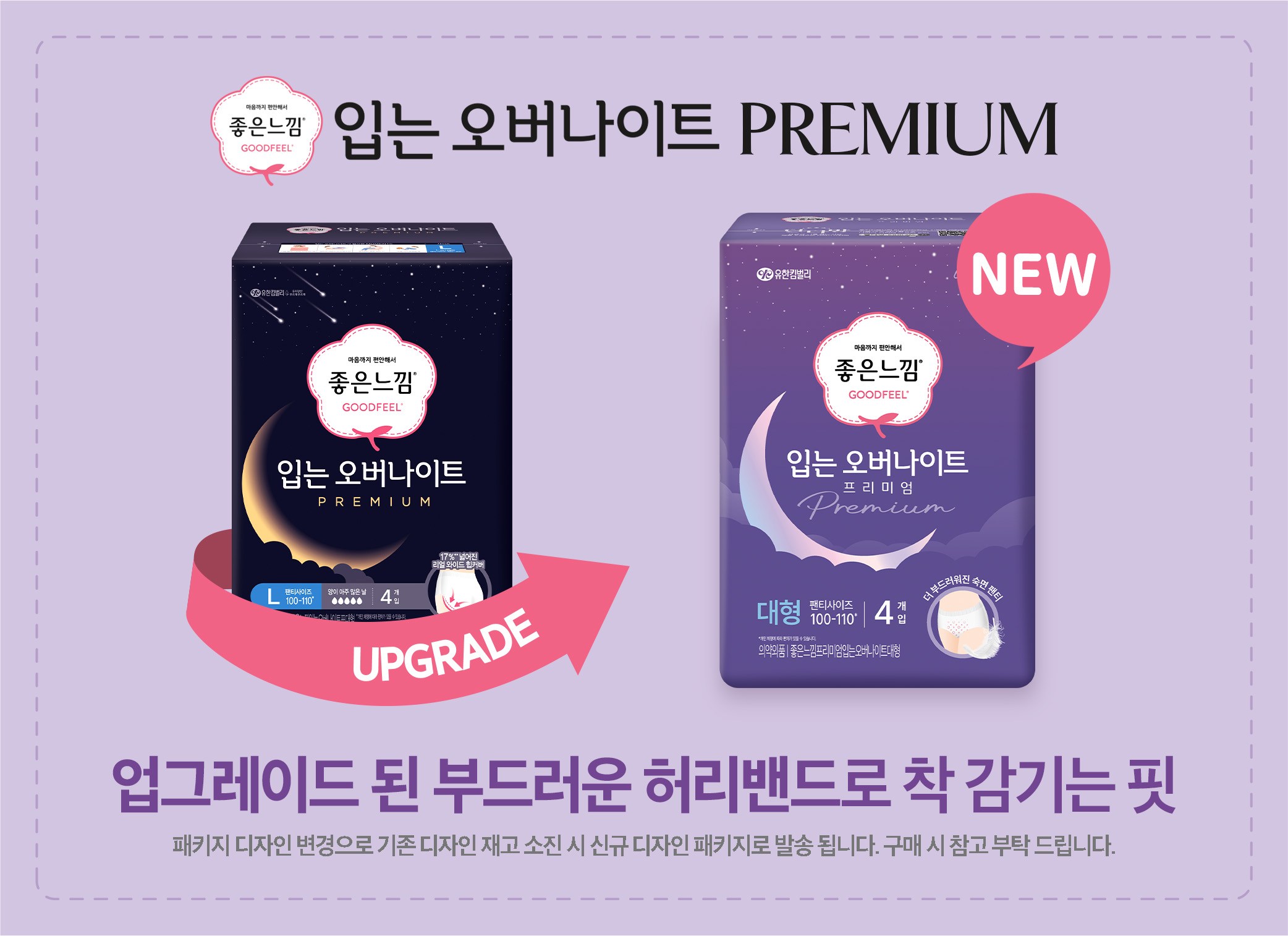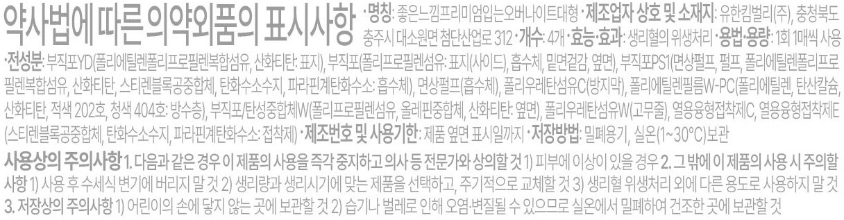 | 품명 및 모델명 | 리뉴얼 전: 좋은느낌입는오버나이트프대형 / 리뉴얼 후: 좋은느낌프리미엄입는오버나이트대형 | 인증/허가 사항 | 의약외품 |