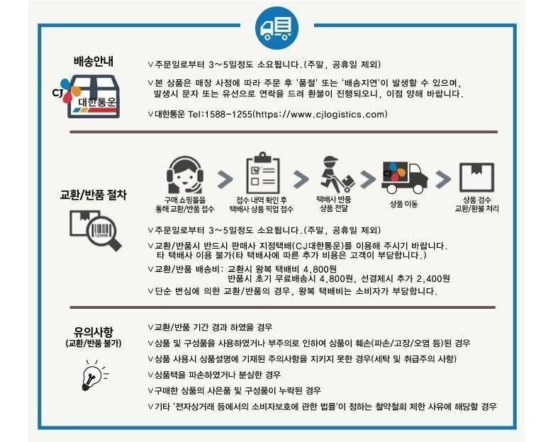 - ㆍ교환/반품에 관한 일반적인 사항은 판매자가 제시사항보다 관계법령이 우선합니다.