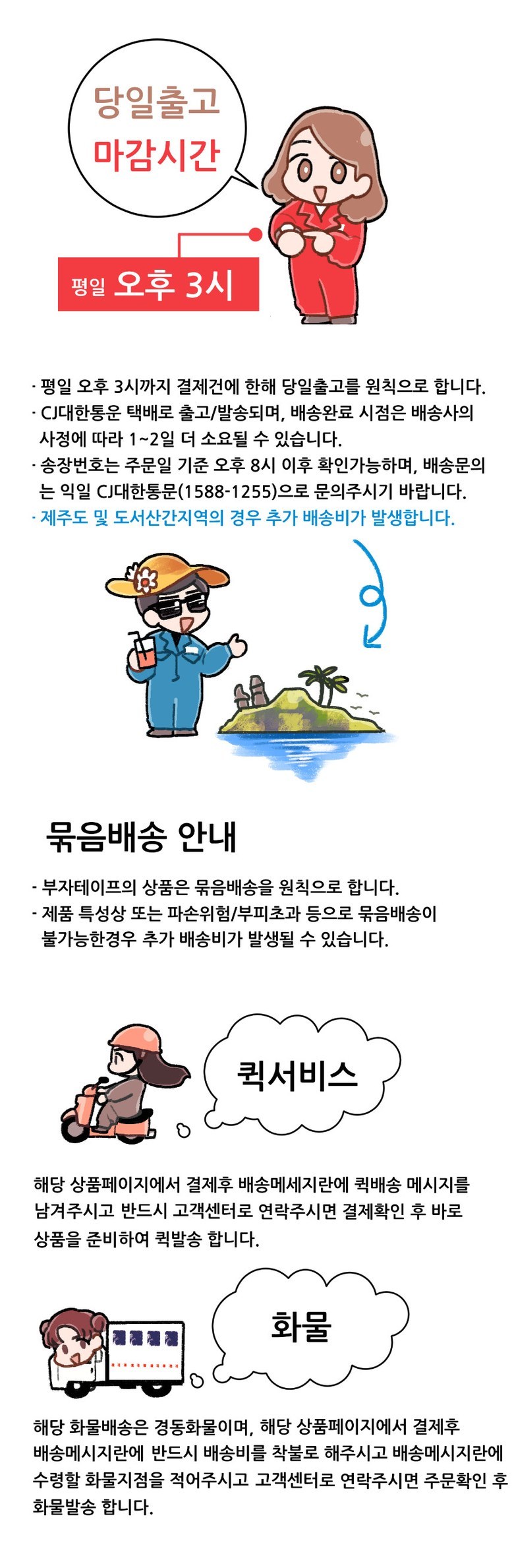 | 배송기간 | ㆍ도서산간 지역 등은 배송에 3-5일이 더 소요될 수 있습니다. - 천재지변, 물량 수급 변동 등 예외적인 사유 발생 시, 다소 지연될 수 있는 점 양해 부탁드립니다. | ||