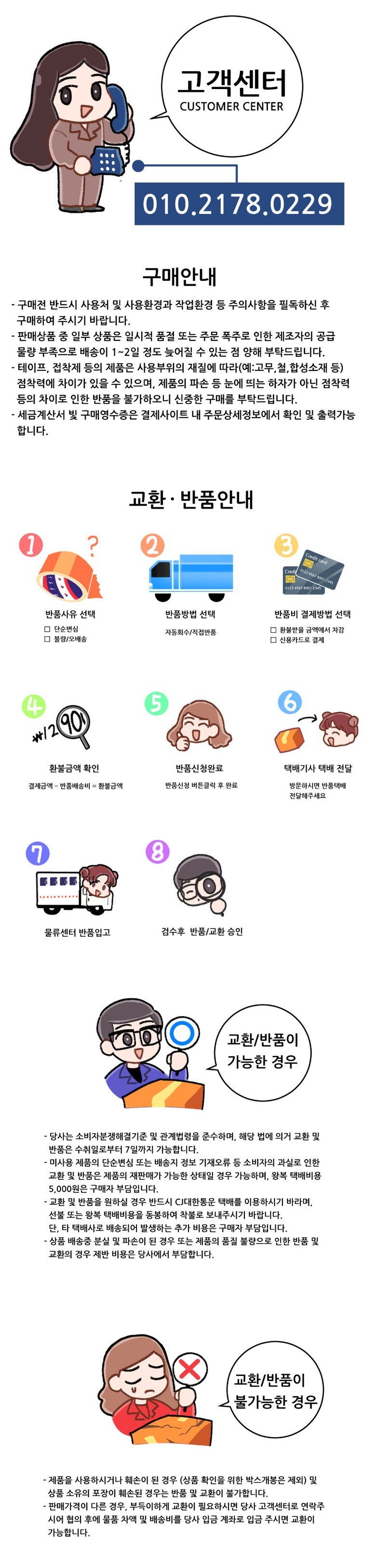 - ㆍ모니터 해상도의 차이로 인해 색상이나 이미지가 실제와 달라, 고객이 단순 변심으로 교환/반품을 무료로 요청하는 경우