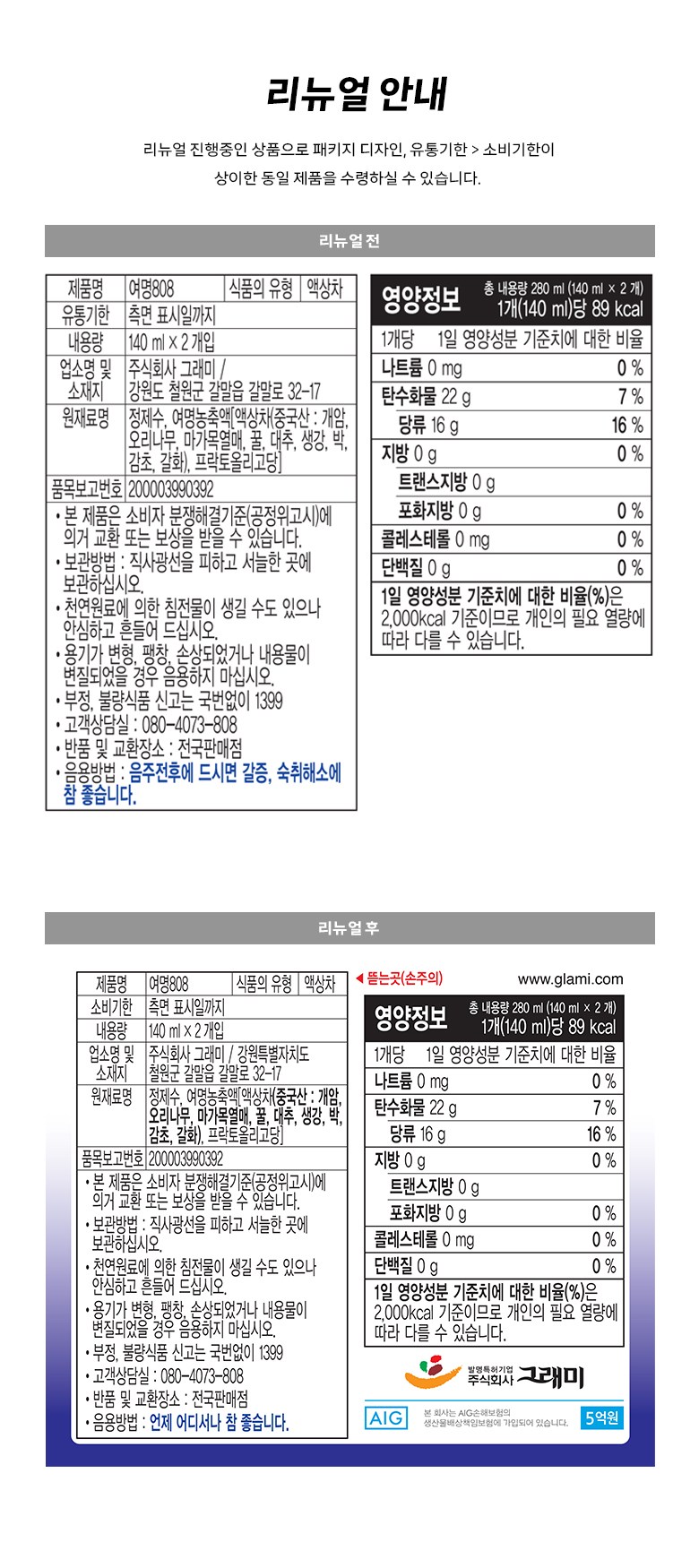 | 포장단위별 내용물의 용량(중량), 수량 | 140ml x 4개 | 원재료명 및 함량 | 컨텐츠 참조 |