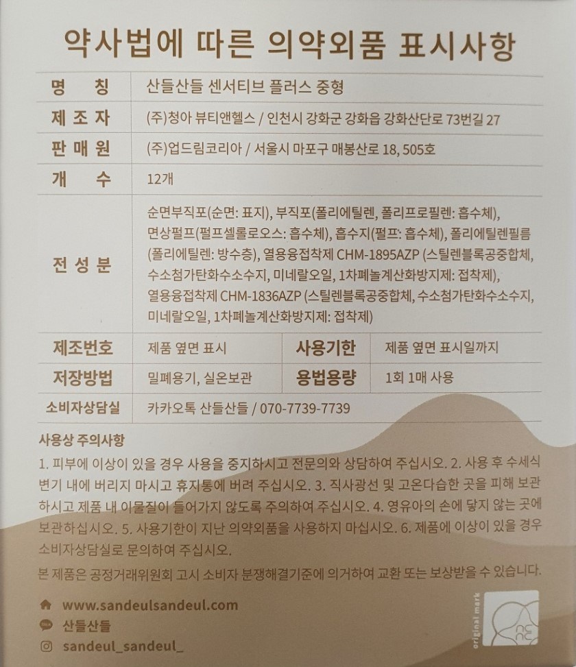 | 품명 및 모델명 | 산들산들센서티브플러스중형 | 인증/허가 사항 | 의약외품 |