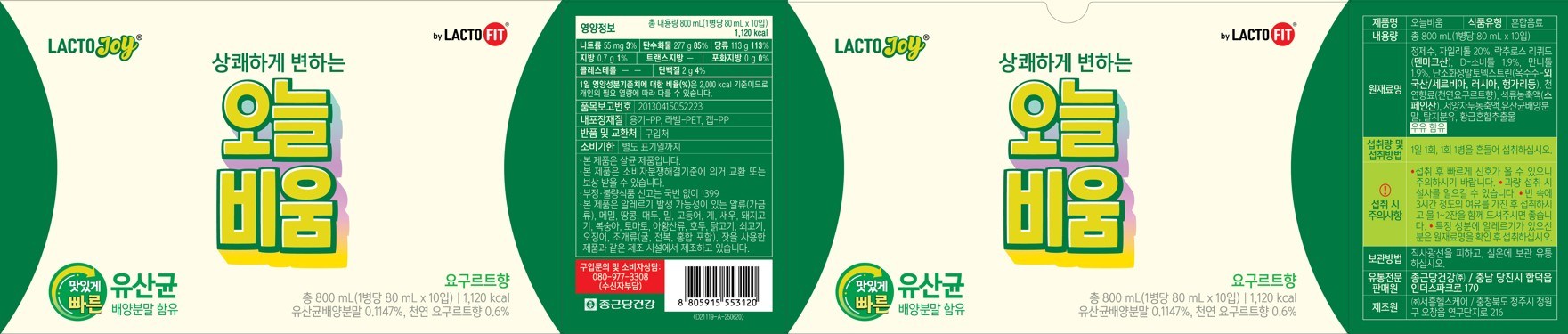 | 포장단위별 내용물의 용량(중량), 수량 | 80ml*20개 | 원재료명 및 함량 | 컨텐츠 참조 |