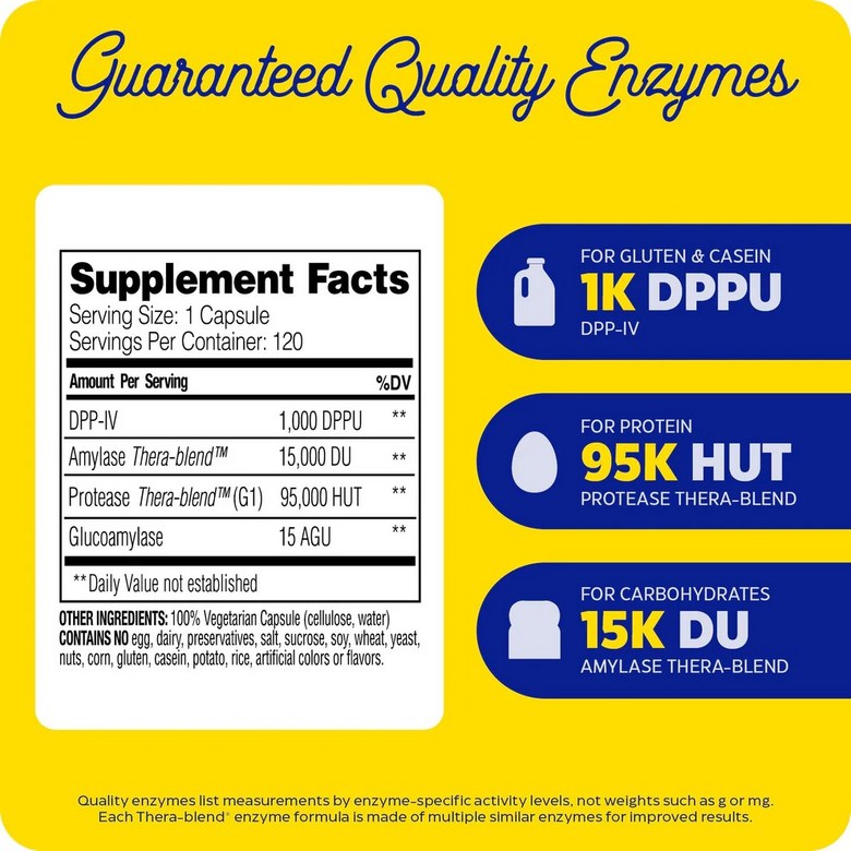 글루텐이나 카제인이 포함된 식사와 함께 1알을 복용하세요. 필요에 따라, 또는 의료 전문가의 지시에 따라 추가로 복용할 수 있습니다.
