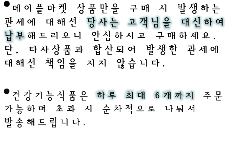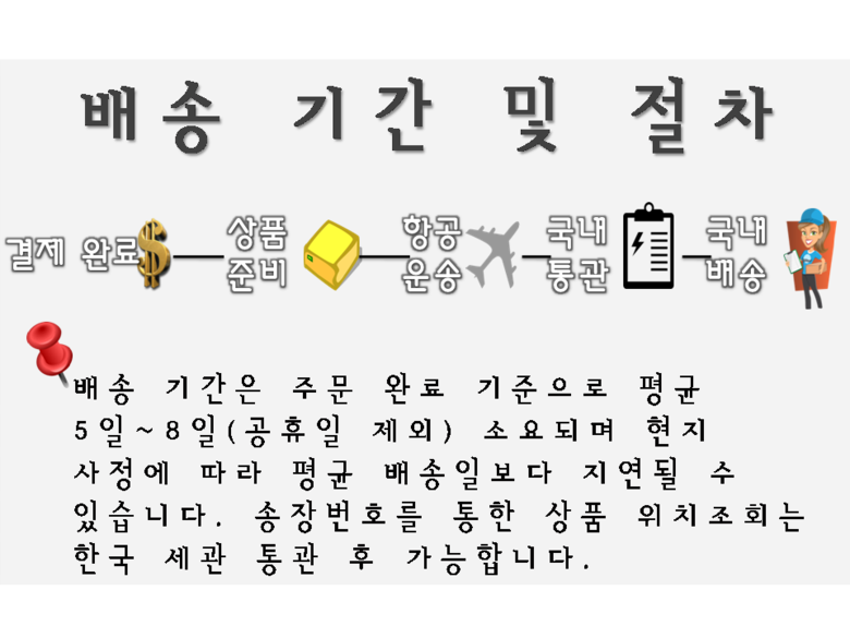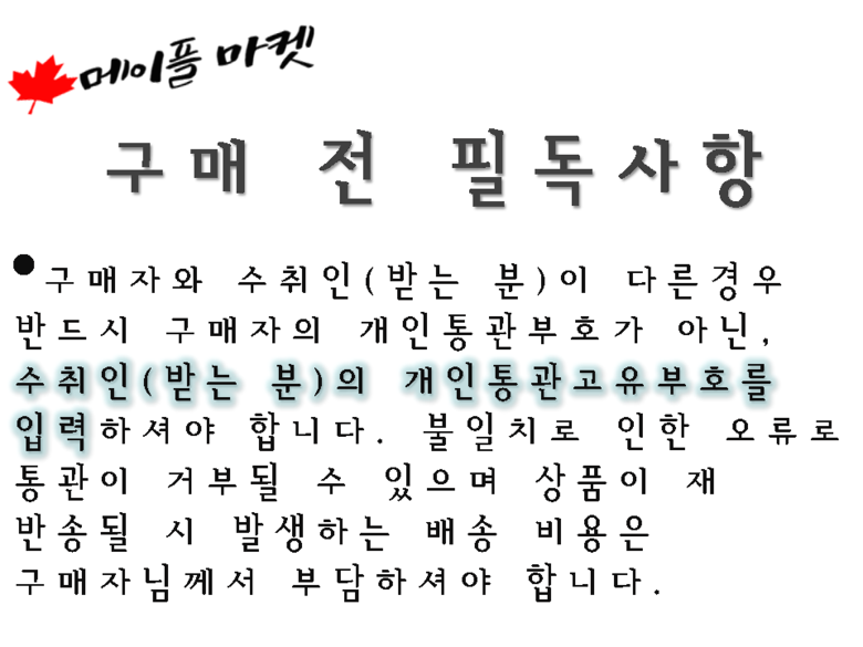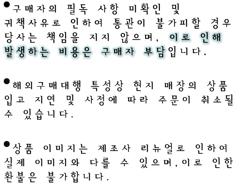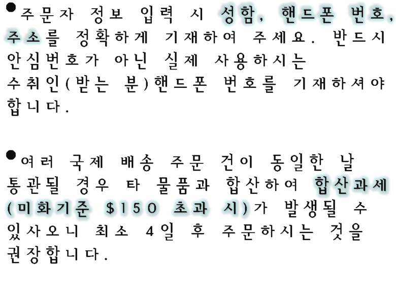 - 주문일 기준 동일 판매자 총 구매 금액이 면세 한도 초과 시 관부가세가 부과될 수 있습니다.