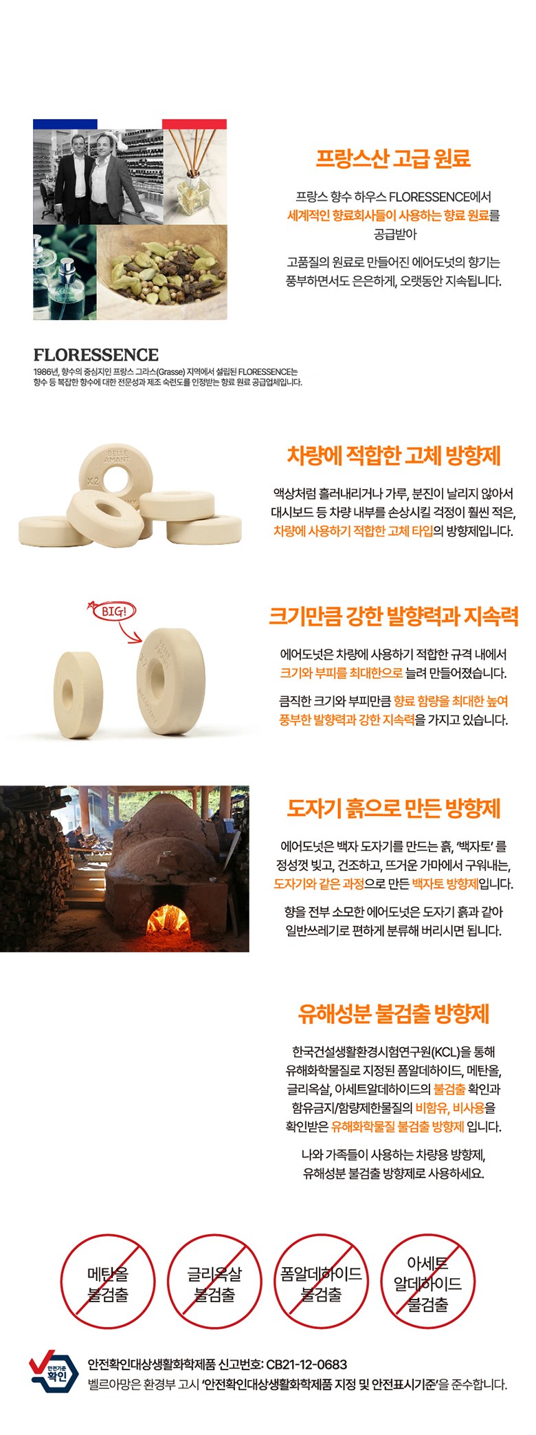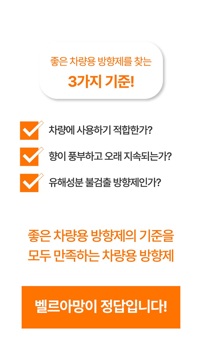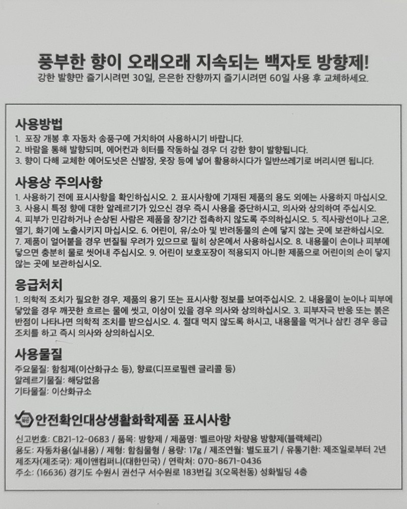 | 품목 및 제품명 | 방향제 / 벨르아망 차량용 방향제 (블랙체리) | 용도(표백제의 경우 계열을 함께표시) 및 제형 | 일반용 (실내공간용), 자동차용 (실내용) / 함침물형 |