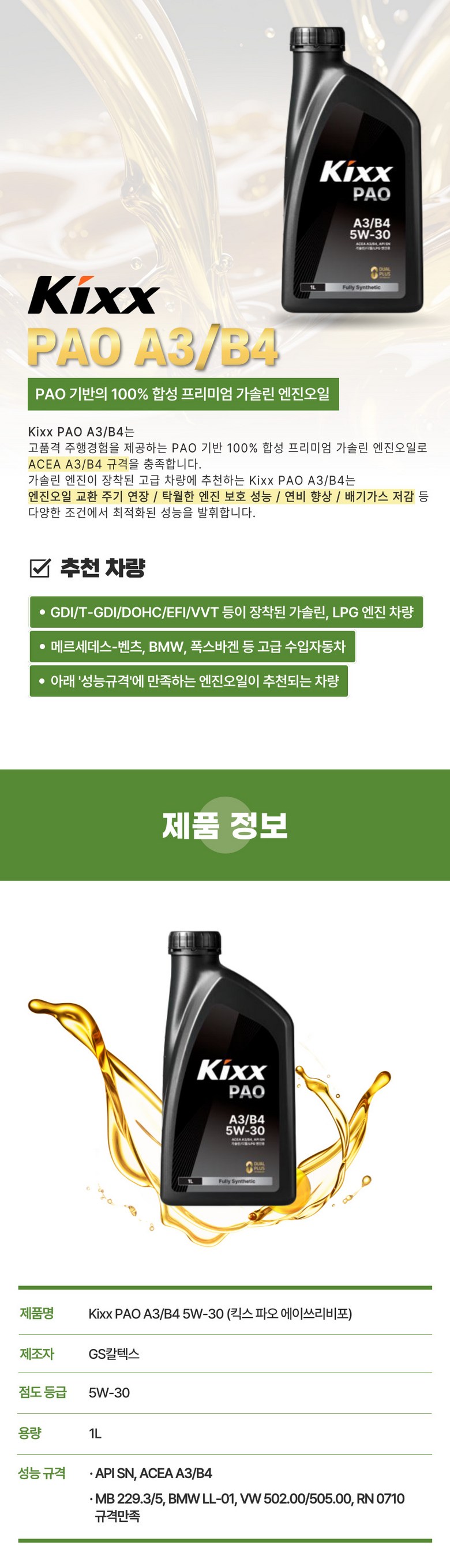 | 품명 및 모델명 | KIXX PAO A3 B4 5W-30 | 동일모델 출시년월 | 상품 상세페이지 참조 |