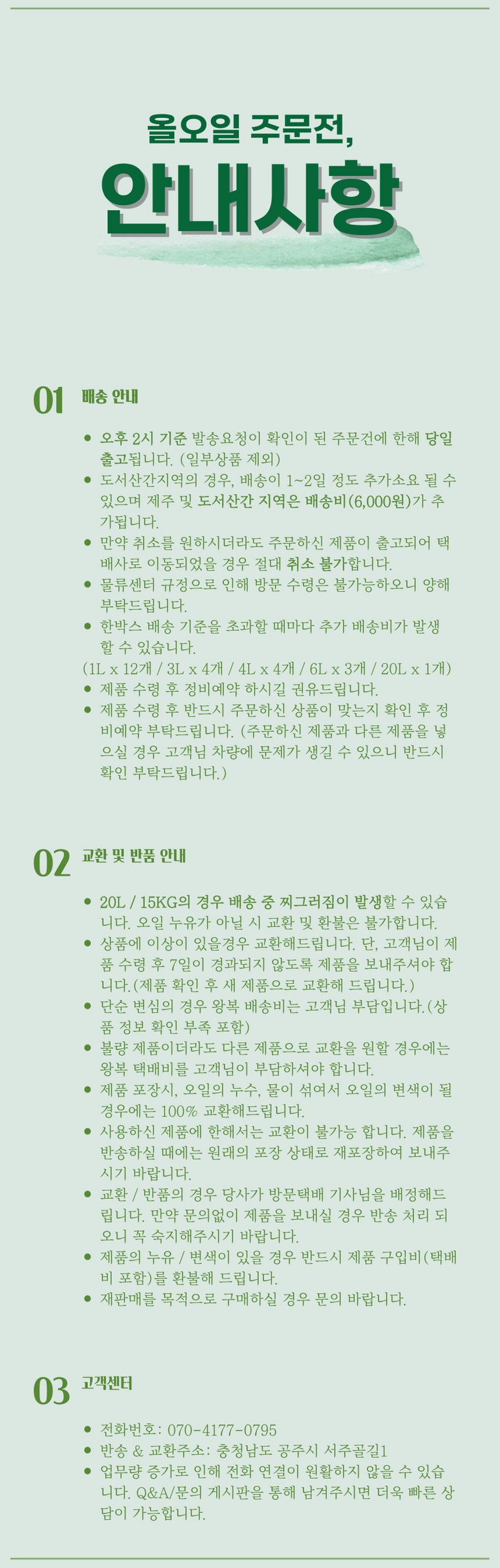 - 상품문의 및 후기게시판을 통해 취소나 환불, 반품 등은 처리되지 않습니다.