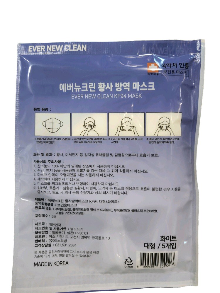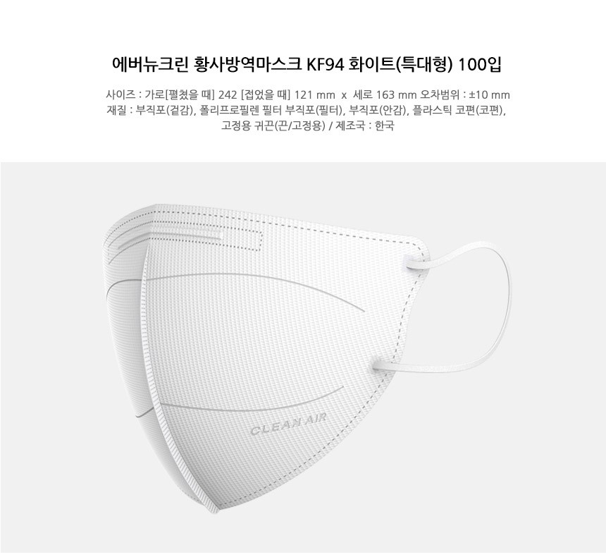 | 품명 및 모델명 | 에버뉴크린 황사방역마스크 KF94 대형(화이트) | 인증/허가 사항 | 의약외품 |