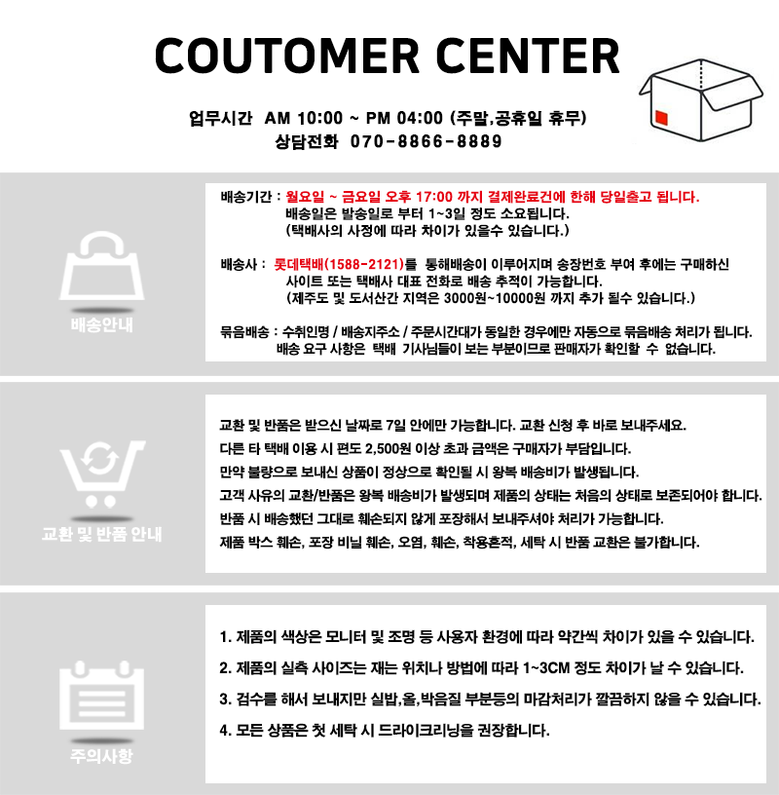 - ㆍ모니터 해상도의 차이로 인해 색상이나 이미지가 실제와 달라, 고객이 단순 변심으로 교환/반품을 무료로 요청하는 경우