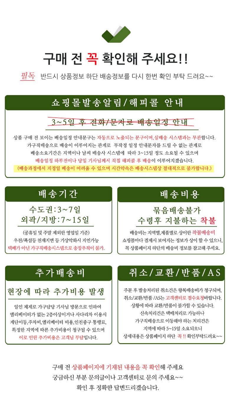 | 배송방법 | 업체직송 | 배송비 | 착불배송(상품별 배송비, 배송가능지역은 상세페이지 참조) - 도서산간 지역 배송불가 |
