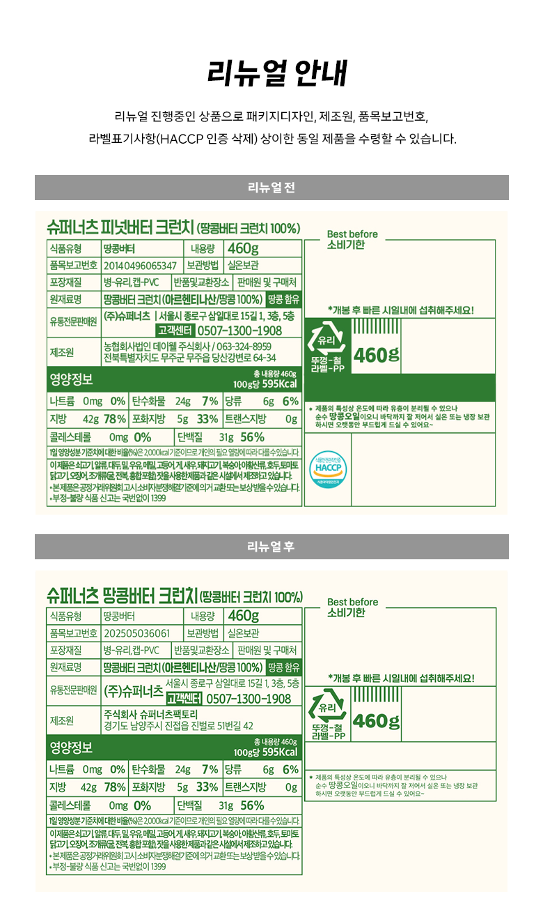 | 제품명 | 슈퍼너츠 땅콩버터 크런치 | 식품의 유형 | 컨텐츠 참조 |