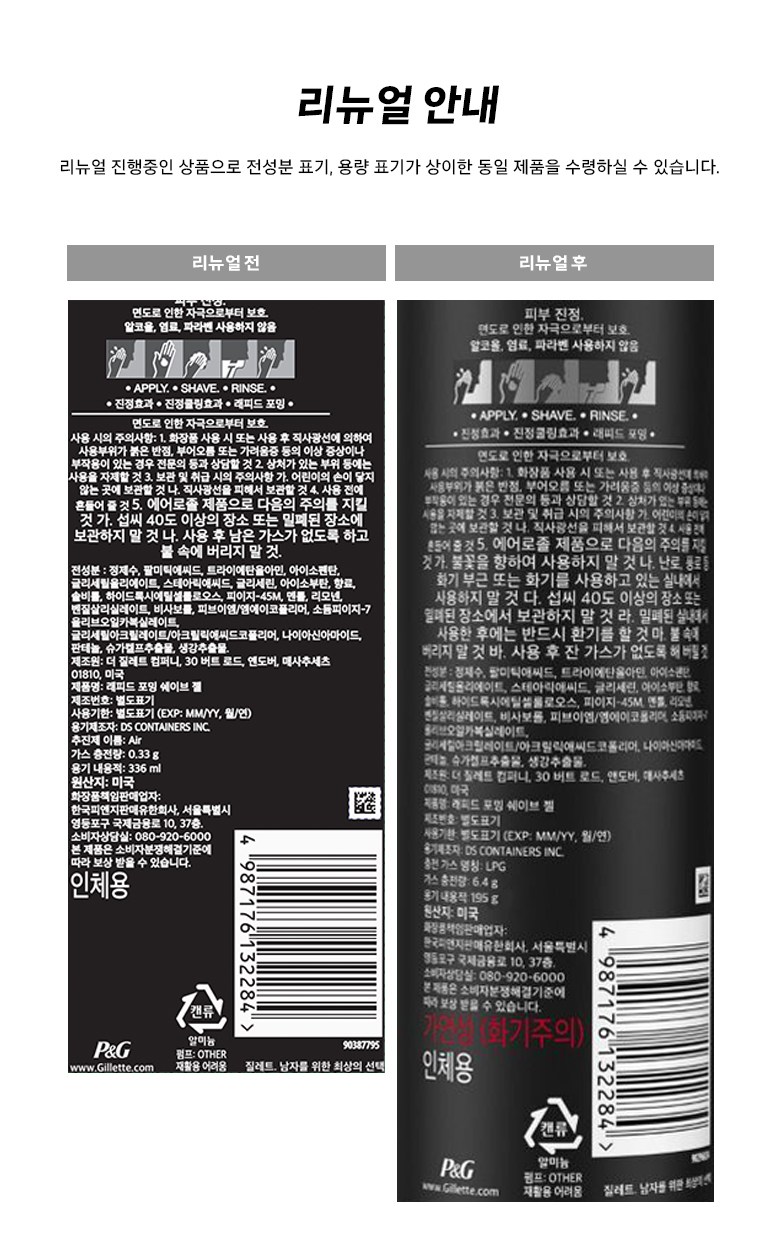 | 화장품제조업자, 화장품책임판매업자 및 맞춤형화장품판매업자 | 더질레트컴퍼니 / 한국피앤지판매유한회사 | 제조국 | 미국 |