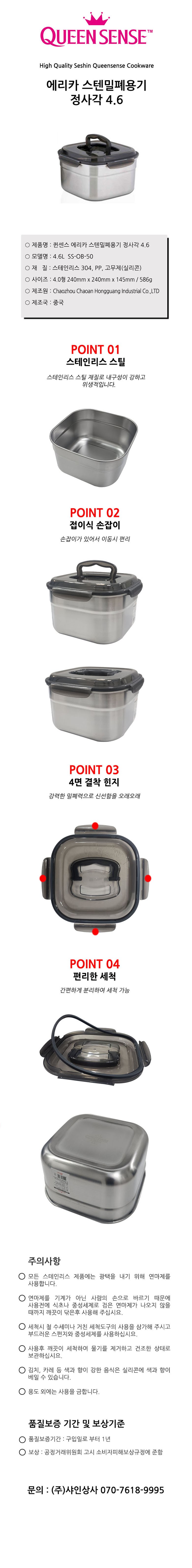 | 품명 및 모델명 | 리뉴얼전:퀸센스 에리카 스텐 밀폐용기 4600ml | 리뉴얼후:세신퀸센스 에리카 스텐밀폐용기 정사각 4.6 / SS-OB-50 | 재질 | 컨텐츠 참조 |