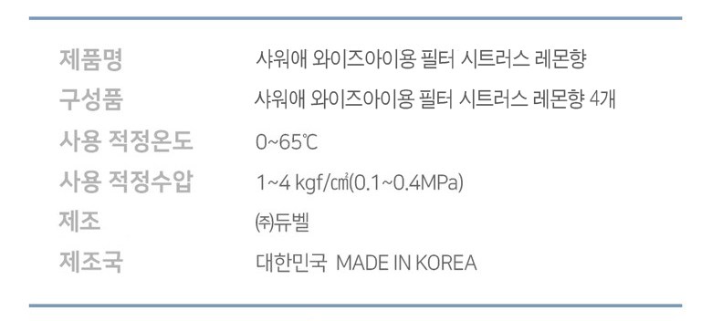 | 품명 및 모델명 | 듀벨 샤워애 와이즈 아이용 필터 | 인증/허가 사항 | 해당없음 |