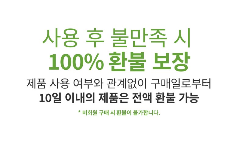 | 교환/반품 신청 기준일 | ㆍ단순변심에 의한 교환/반품은 제품 수령 후 7일 이내까지, 교환/반품 제한사항에 해당하지 않는 경우에만 가능 (배송비용과 교환/반품 비용 왕복배송비 고객부담) ㆍ상품의 내용이 표시·광고의 내용과 다른 경우에는 상품을 수령한 날부터 3개월 이내, 그 사실을 안 날 또는 알 수 있었던 날부터 |
