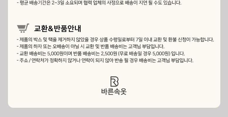 - ㆍ모니터 해상도의 차이로 인해 색상이나 이미지가 실제와 달라, 고객이 단순 변심으로 교환/반품을 무료로 요청하는 경우