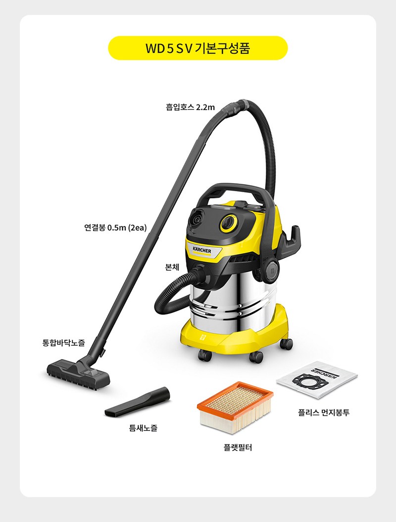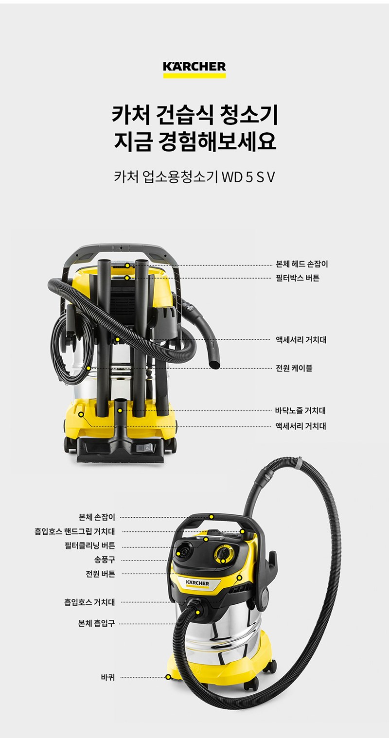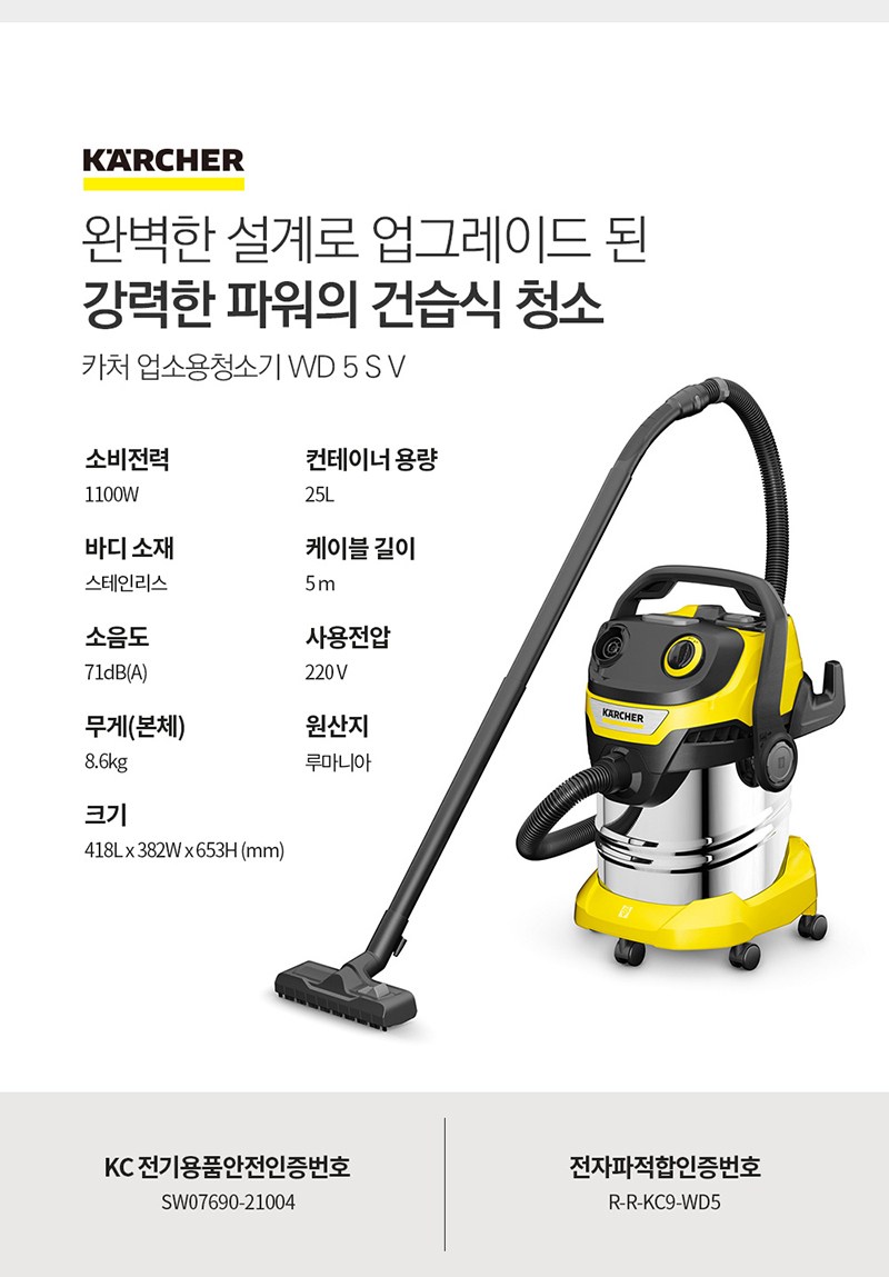 | 품명 및 모델명 | 카처 건습식 업소용청소기 WD5 S V | KC 인증정보 | SW07690-21004, R-R-KC9-WD5 |