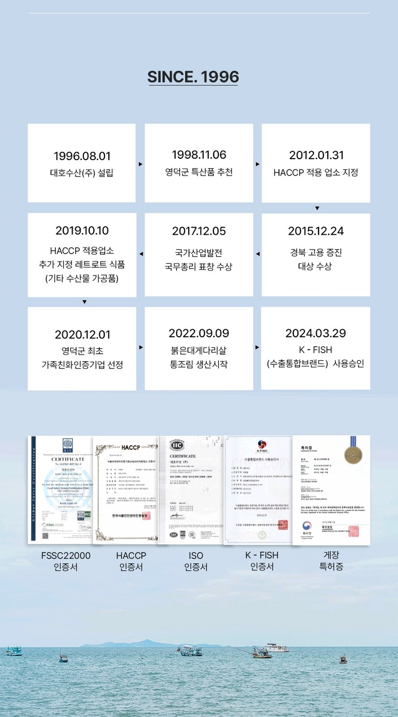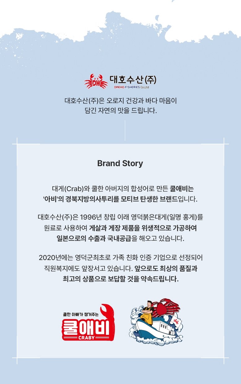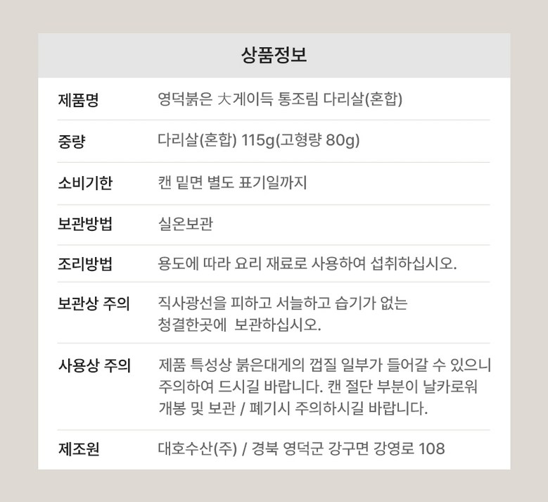 | 생산자 및 소재지 | 생산자 : 대호수산(주)소재지 : 경북 영덕군 강구면 강영로 108 | 제조연월일, 소비기한 또는 품질유지기한 | 소비기한(또는 유통기한) : 2027년 07월 02일 이거나 그 이후인 상품 제조년월일 : 2025년 07월 03일 이후인 제조상품 |
