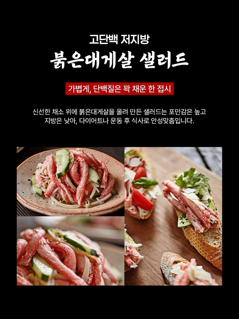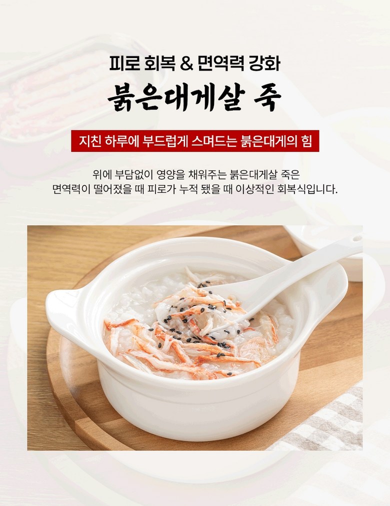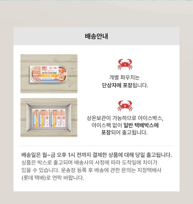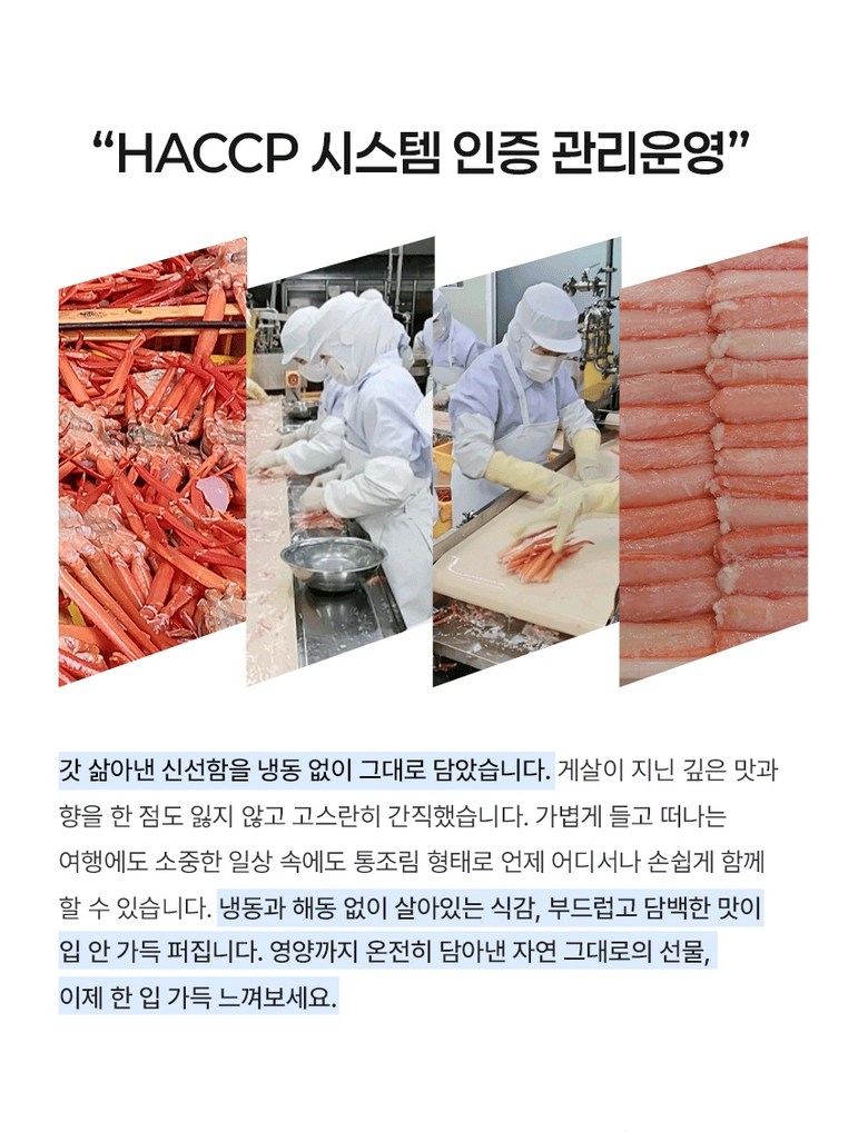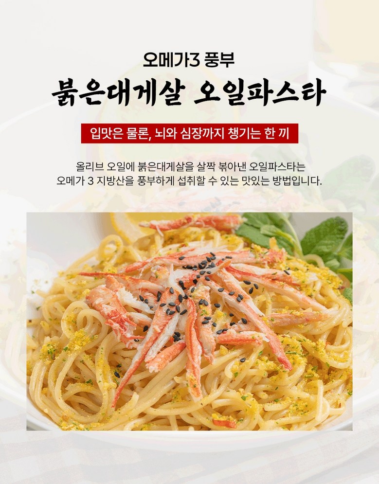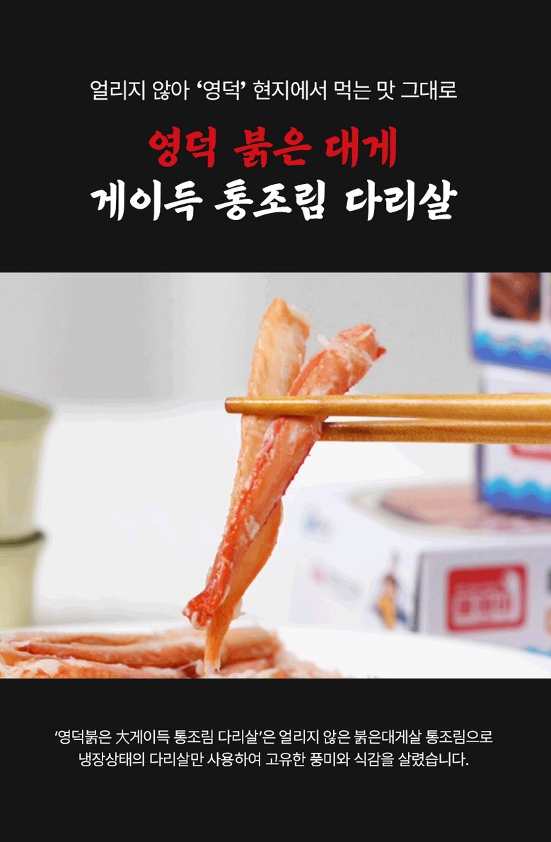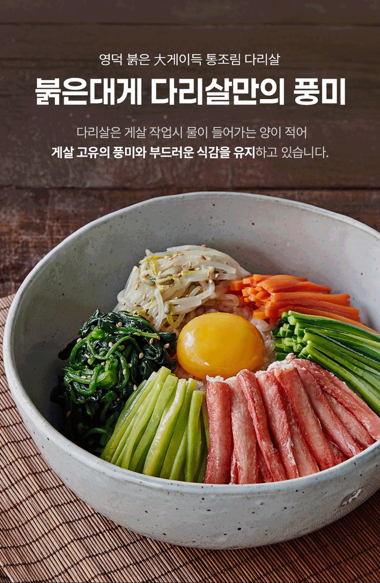 | 포장단위별 내용물의 용량(중량), 수량 | 상품 상세페이지 참조 | 원재료명 및 함량 | 게살(국내산/동해안) 69.57%, 정제수, 설탕, D-소비톨액(감미료), 가공소금, L-글루탐산나트륨(향미증진제), 구연산(무수)[산도조절제], 이.디.티.에이. 칼슘이나트륨(산화방지제) |