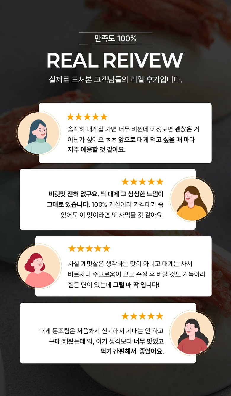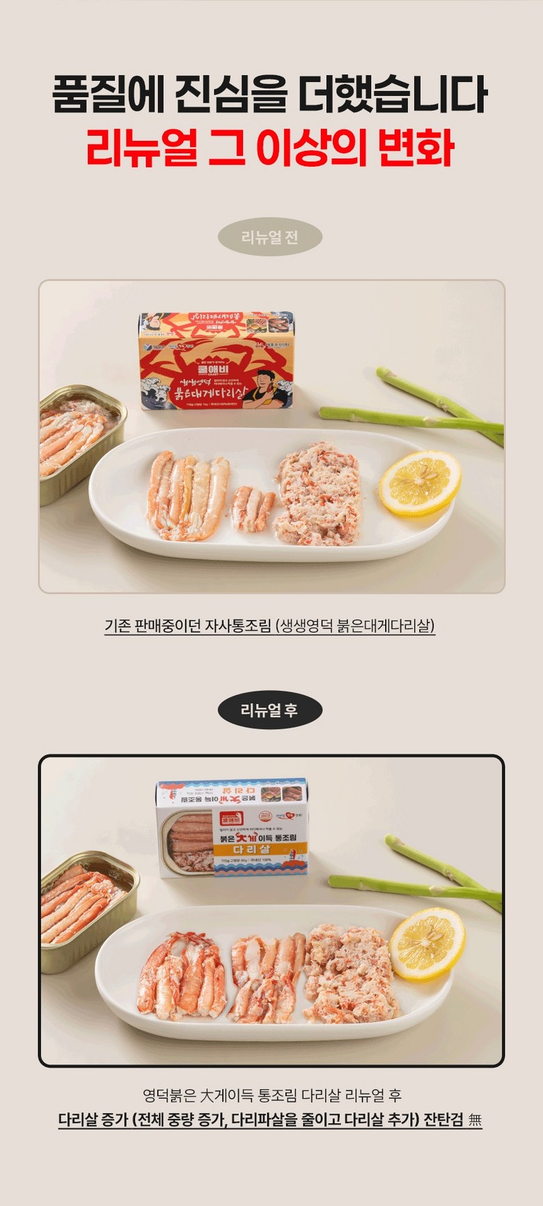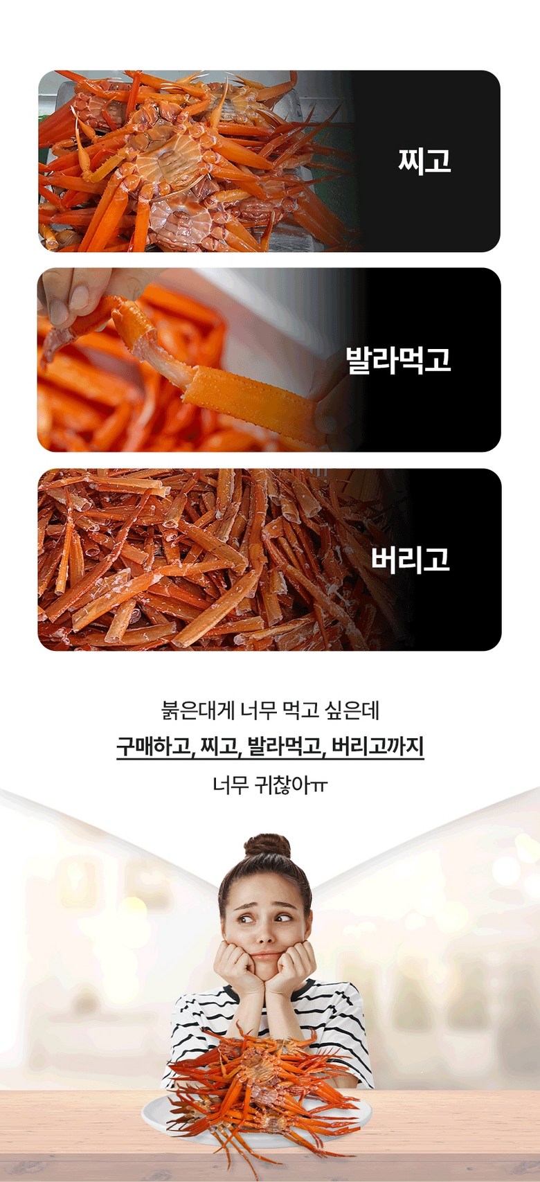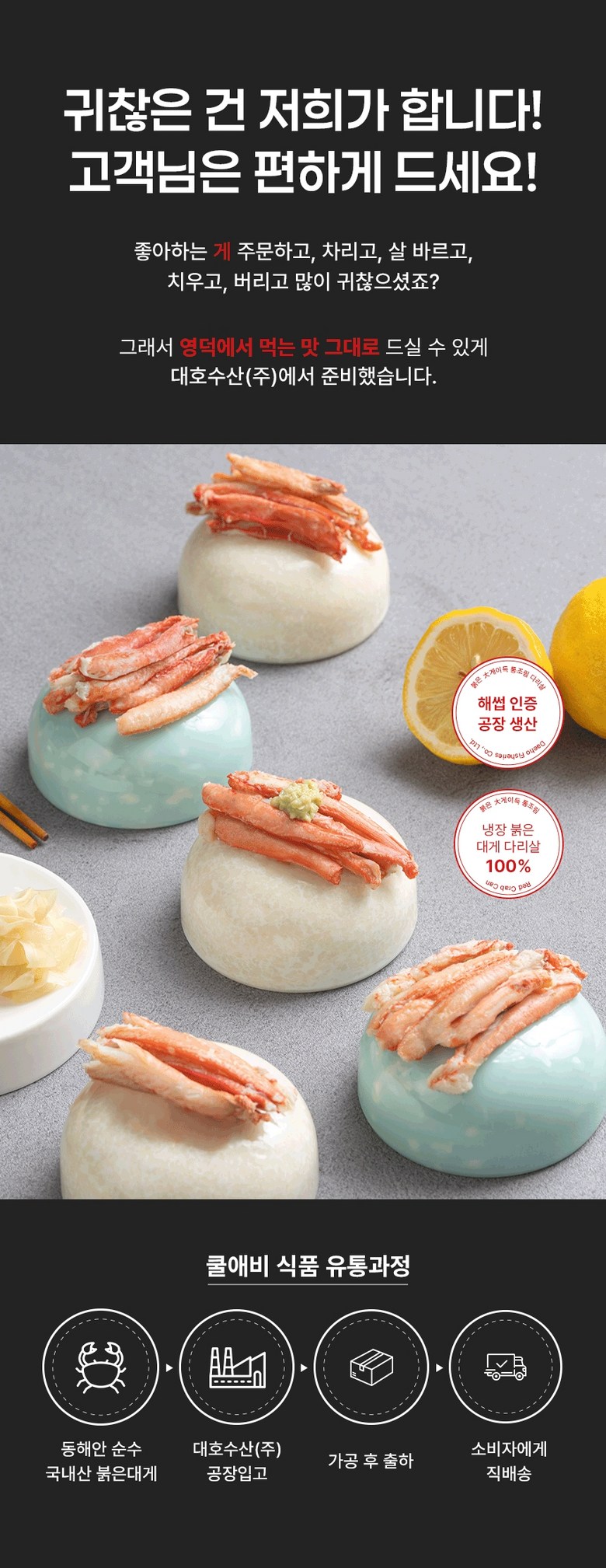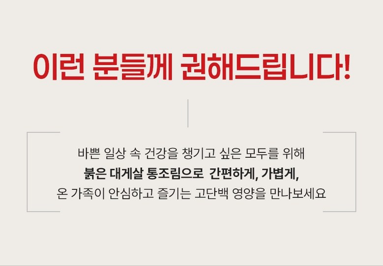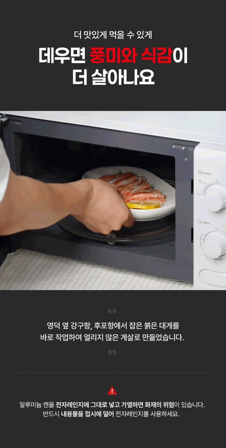 | 포장단위별 내용물의 용량(중량), 수량 | 상품 상세페이지 참조 | 원재료명 및 함량 | 게살(국내산/동해안) 69.57%, 정제수, 설탕, D-소비톨액(감미료), 가공소금, L-글루탐산나트륨(향미증진제), 구연산(무수)[산도조절제], 이.디.티.에이. 칼슘이나트륨(산화방지제) |