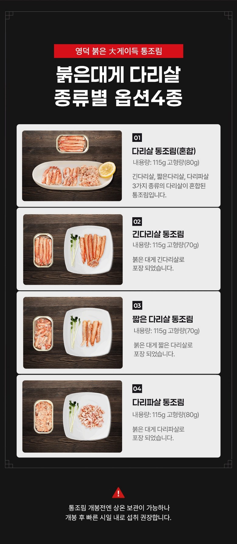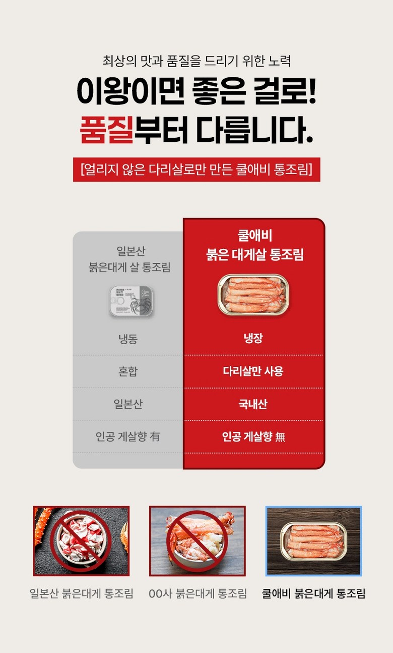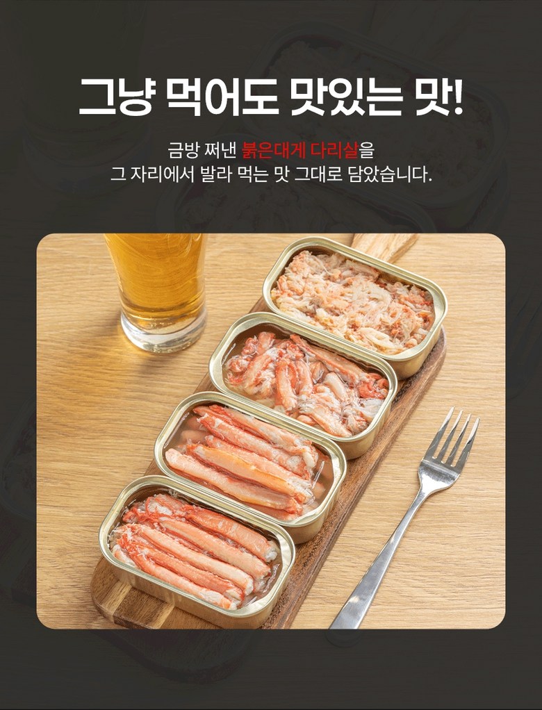| 제품명 | 쿨애비 붉은대게이득 통조림 다리살 | 식품의 유형 | 상품 상세페이지 참조 |