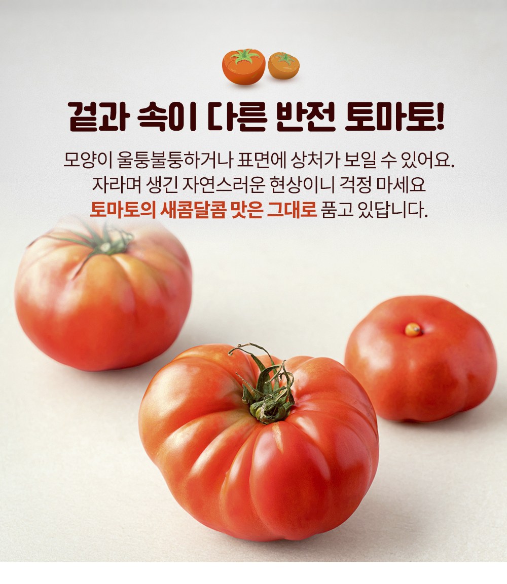 · 크기나 모양이 일정하지 않거나, 약간의 흠집이 있는 토마토가 포함된 주스용 상품이에요. 토마토의 달콤한 맛은 그대로 품고 있으니 주스로 갈아 드셔보세요. 파스타나 볶음 요리에 활용하셔도 맛있게 즐길 수 있답니다.