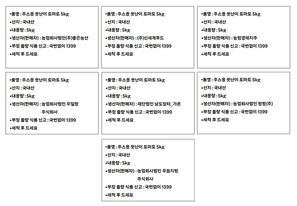 | 제조연월일, 소비기한 또는 품질유지기한 | 제조년월일 : 2025년 12월 15일 이후인 제조상품 | 세부 품목군별 표시사항 | 농수산물 : 유전자변형(해당 없음) / 지리적 표시사항(해당 없음) |
