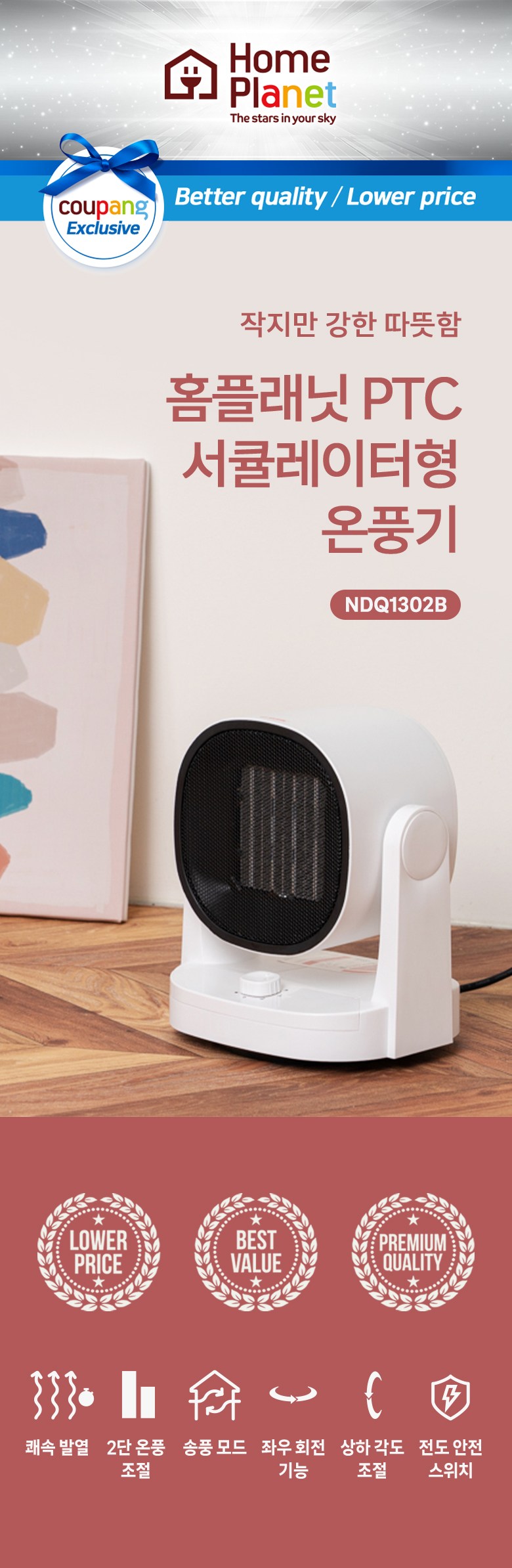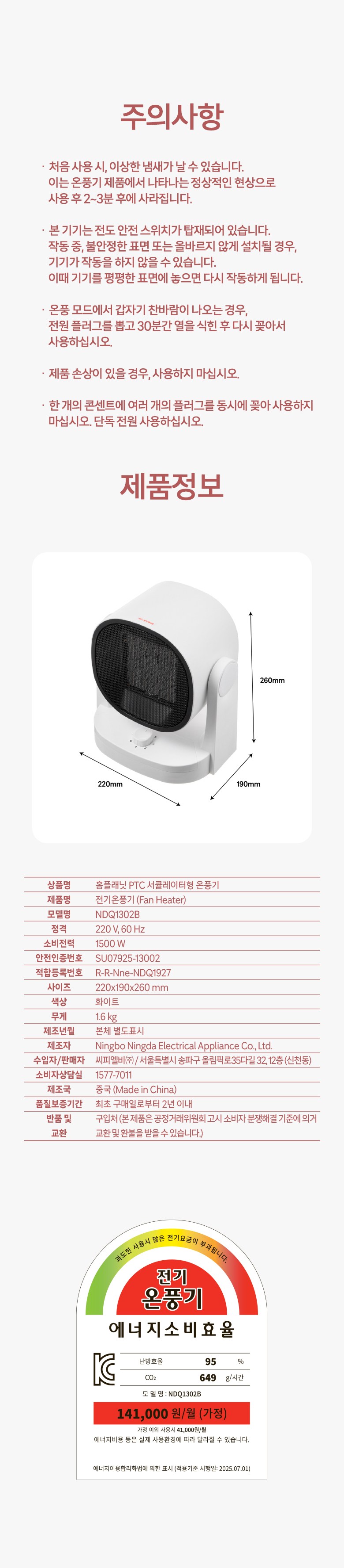 | 품명 및 모델명 | 홈플래닛 PTC 서큘레이터형 온풍기, NDQ1302B | KC 인증정보 | SU07925-13002,R-R-Nne-NDQ1927 |