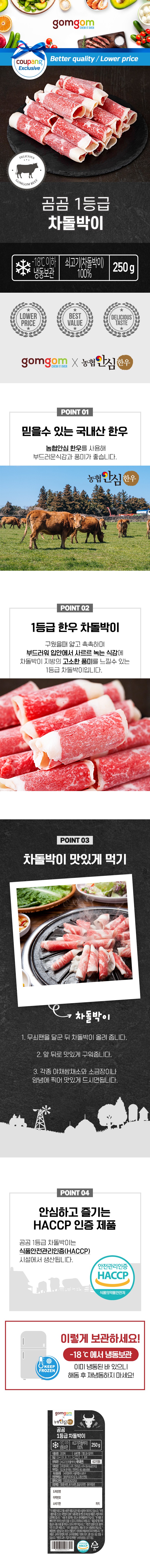 | 품목 또는 명칭 | 1등급 한우 차돌박이 (냉동) | 포장단위별 내용물의 용량(중량),수량,크기 | 250g, 1개 |