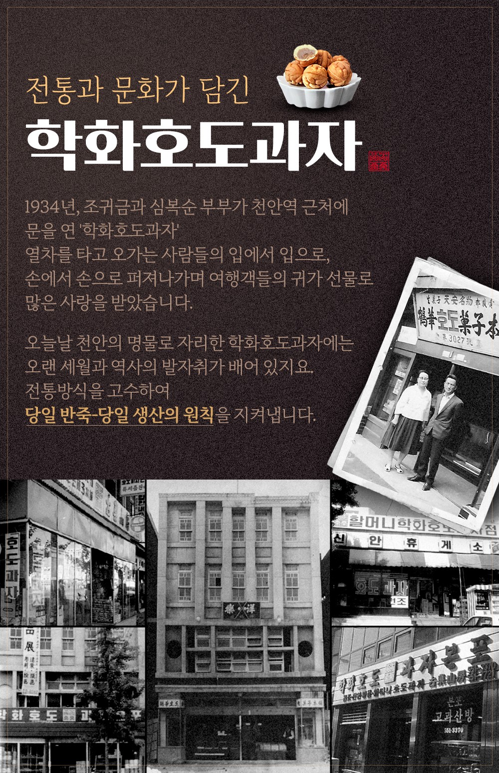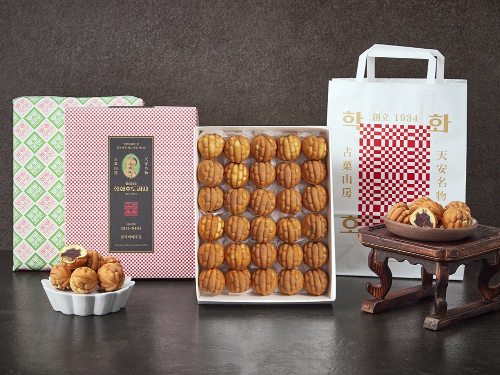’호도’라고 전래된 과정은 여러 가지 추측이 있는데요. 그 중 하나를 설명해드릴게요. 호두 열매가 복숭아처럼 생겼으나, 외과피를 먹을 수 없다는 데서 나온 설이에요. ‘복숭아(桃)’에 낮잡아 이를 때 쓰는 접두사 ‘호(胡)’를 붙여 ‘호도(胡桃)’라고 불렸다고 해요. 세월이 흐르며 'ㅗ→ㅜ' 변화의 영향을 받아 '호두'가 되었지만, 학화호도과자에선 옛 말 그대로 '호도과자'라고 부른답니다.