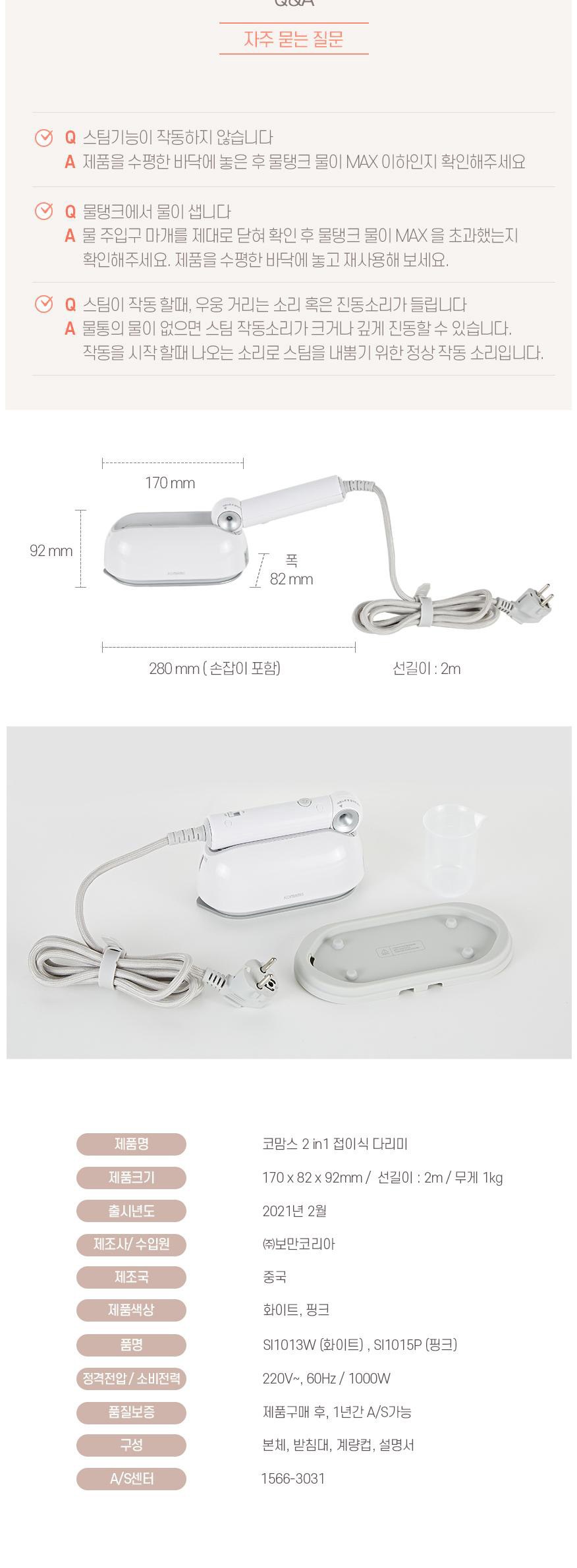 | 품명 및 모델명 | 코맘스 2IN1 접이식 스팀 건식 다리미 화이트 / SI1013W | KC 인증정보 | HU072109-20007A / R-R-bmk-DH-400A |