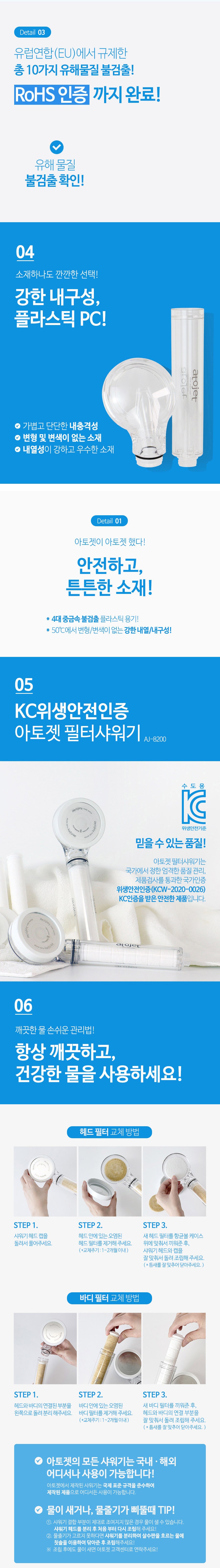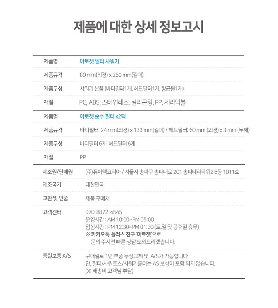 | 품명 및 모델명 | 아토젯 필터샤워기 1년세트 / AJ-8200 | 인증/허가 사항 | KCW-2020-0026 |