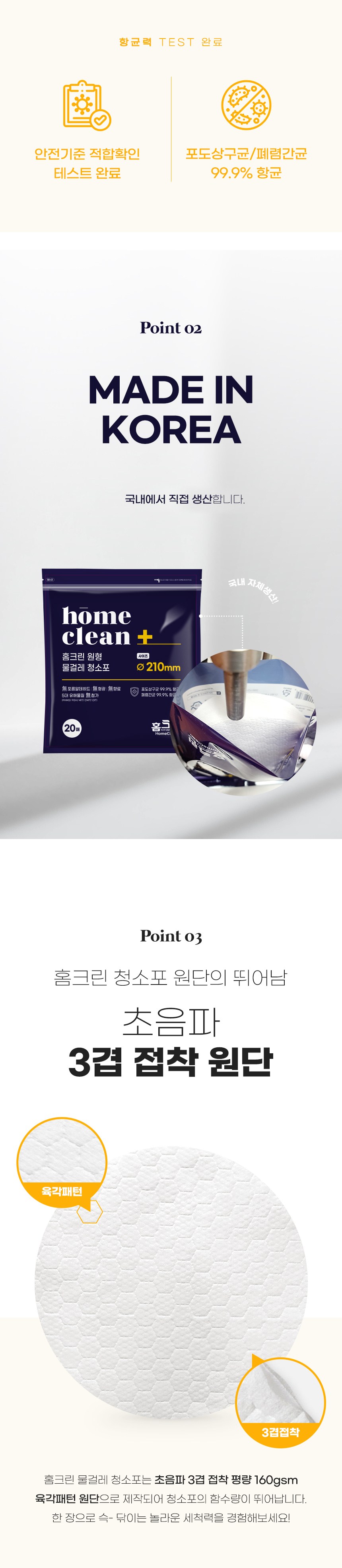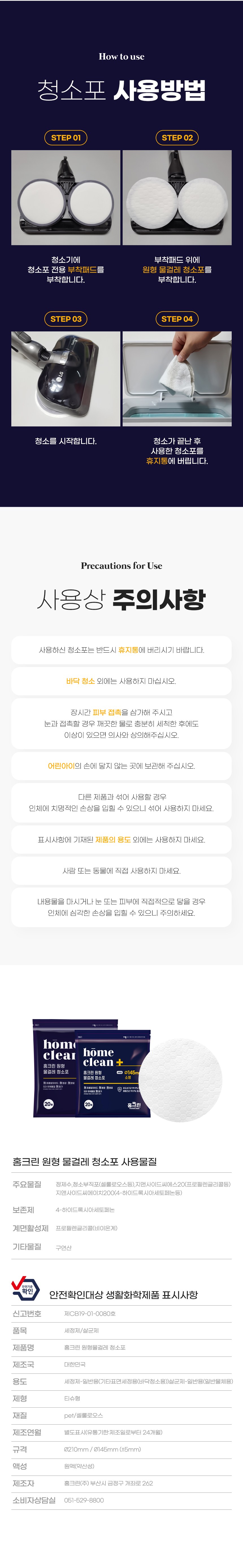 | 품목 및 제품명 | 세정제, 살균제 / 홈크린원형물걸레청소포(소형) | 용도(표백제의 경우 계열을 함께표시) 및 제형 | 일반용-기타표면세정용-바닥청소용,일반용-일반물체용 / 비분사형-티슈형 |