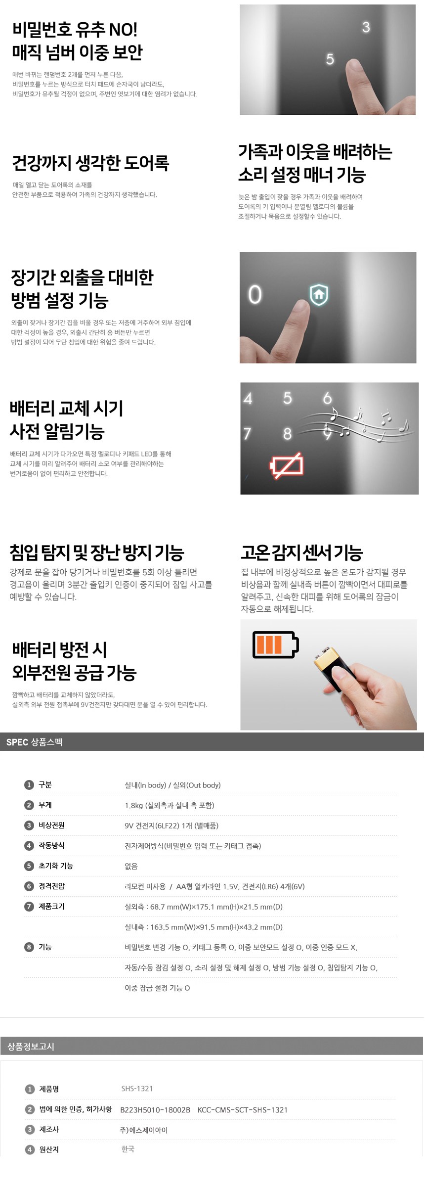 | 품명 및 모델명 | 디지털 도어록 / SHS-1321 | KC 인증정보 | 본품 : B223H5010-18002B, KCC-CMS-SCT-SHS-1321 |